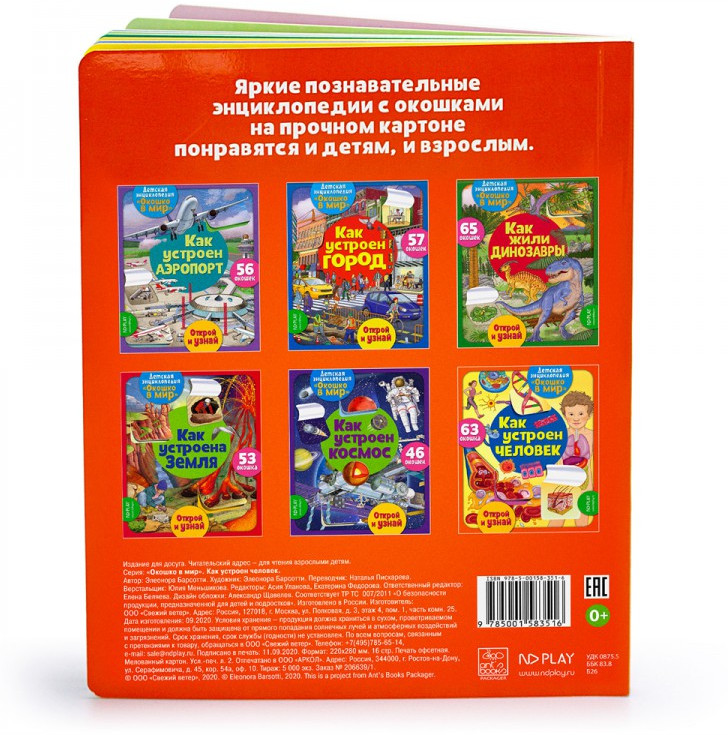 ND Play Как устроен человекВ данный момент этот товар отсутствует в продаже. Возможно, у нас найдется аналогичный или похожий товар здесь. Серия: Окошко в мир Детская интерактивная энциклопедия с бумажными окошками, понятными, красочными иллюстрациями доступно и в увлекательной форме расскажет и продемонстрирует ребёнку, как устроен человек. В каждом из 63 окошек «спрятаны» интересные факты и картинки: это уникальная возможность для ребёнка заглянуть вовнутрь процесса, предмета или явления, выступив в роли исследователя и открывателя. В энциклопедии есть информация о клетках как кирпичиках жизни, системе кровообращения, легких и дыхании, скелете и мышцах, пищеварительной и нервной системах, органах чувств и о том, как человек появляется на свет. Информация в книге преподносится короткими предложениями и небольшими текстовыми блоками, определения звучат легко и понятно. Энциклопедия имеет гладкие картонные страницы. Книга итальянского автора и художника Элеоноры Барсотти «Как устроен человек» переведена на несколько языков, в том числе, и на русский. Издание предназначено для чтения взрослыми детям. |