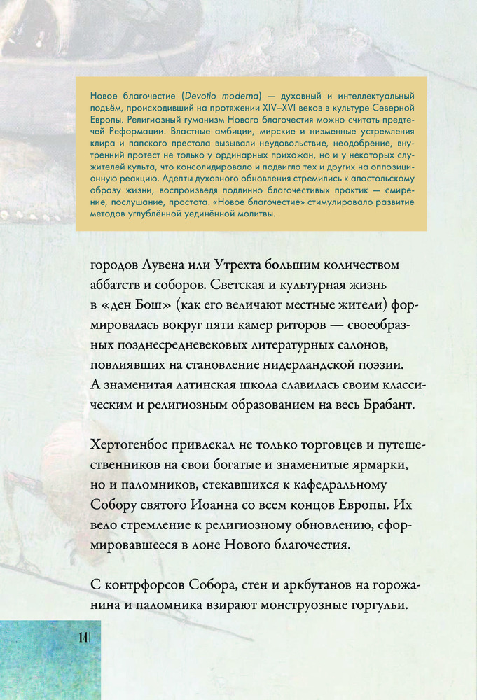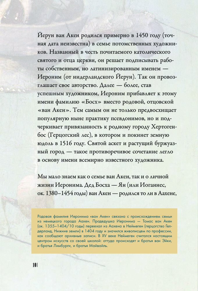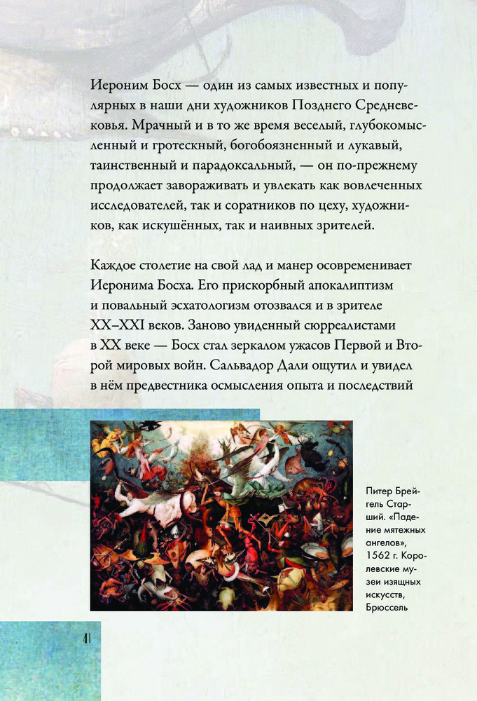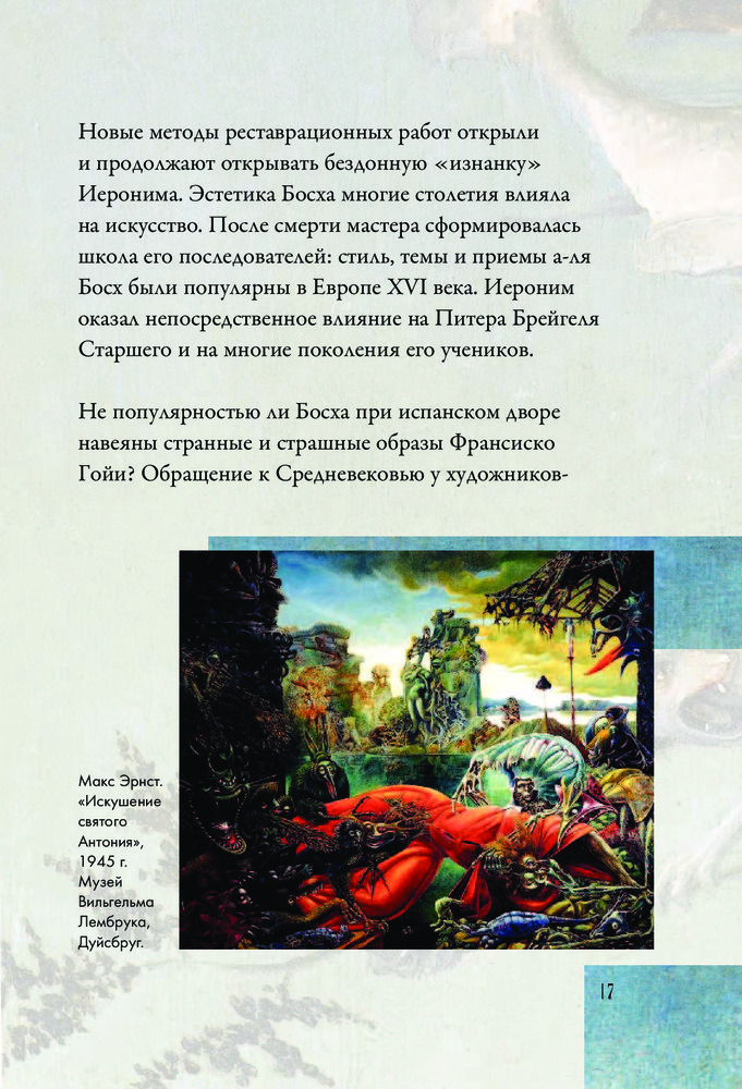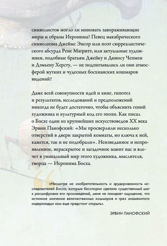Легенда мировой живописи, Босх прославился не столько как талантливый рисовальщик, но как искусный мистификатор, изобретатель собственного живописного языка, в котором низменное переплетается с возвышенным, порочное безжалостно обличается, а повседневное и «нормальное» извращается в макабрической пляске. Познать Босха — значит заглянуть в сознание средневекового человека, понять, над чем он смеется, чего боится, что презирает, а перед чем благоговеет.