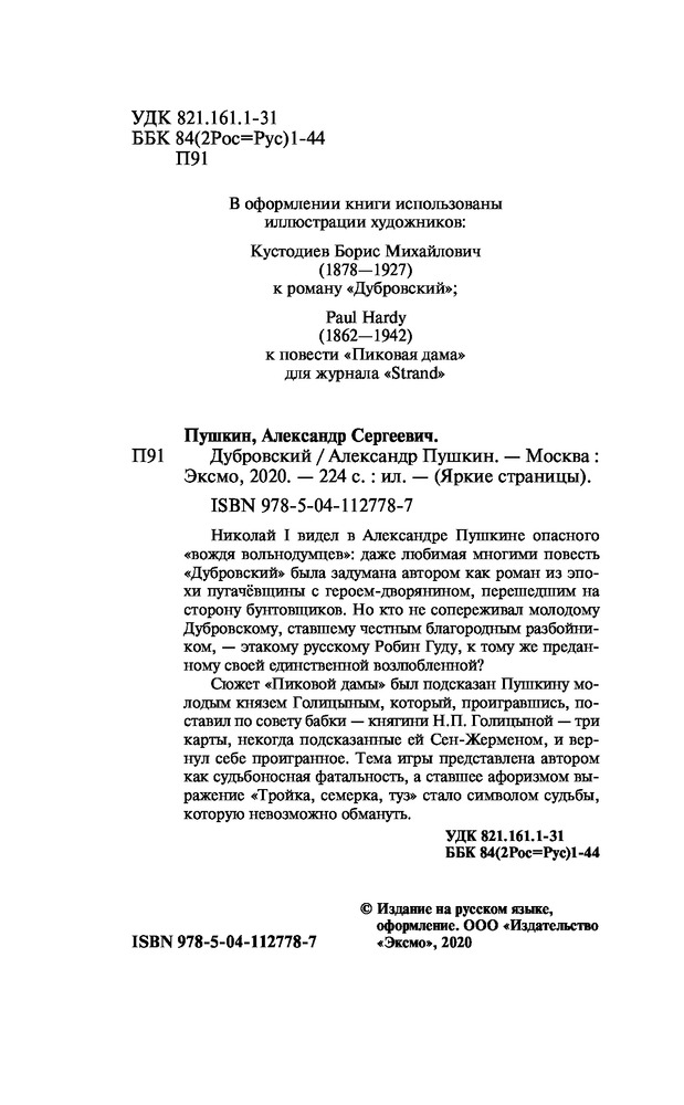 💳 Оплатить за товар можно при получении 🇰🇿 Есть бесплатная доставка по Казахстану от 1 дня 🎁 Копите бонусы с каждой покупки Серия: Яркие страницы Повесть А. Пушкина «Дубровский» рассказывает о любви Владимира Дубровского и Марии Троекуровой — потомков двух враждующих помещичьих семейств. Существуют разные мнения о повести: как о неудаче поэта, писавшего совсем в духе Вальтера Скотта и наоборот, как о достижении — именно с этой повести А. Пушкин завершил провинциальную и открыл мировую русскую прозу. |