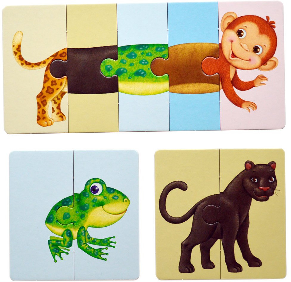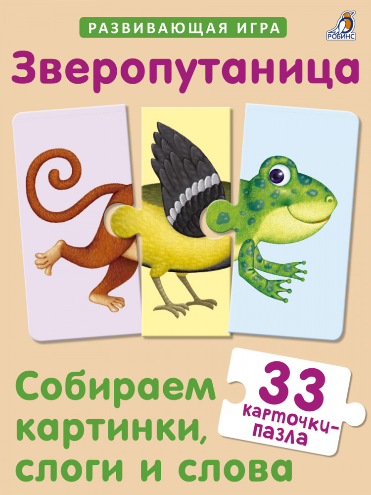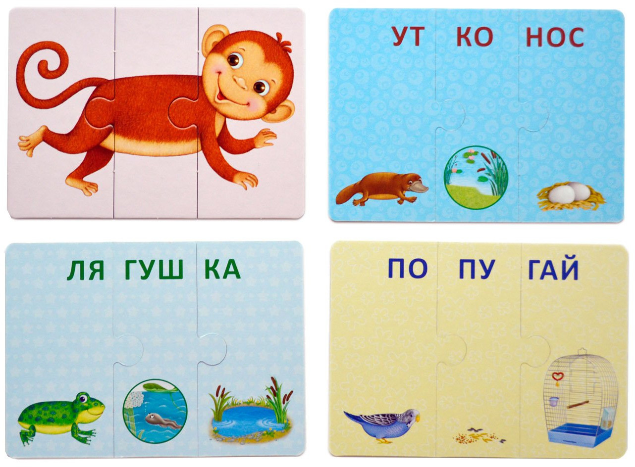 В наборе 33 карточки-пазла, из которых ребёнок сможет складывать картинки животных и слова, состоящие из трёх слогов. В игре используется и лицевая, и оборотная сторона карточек. Проверить правильность собранного слова можно, перевернув их. Если слово собрано верно, то с другой стороны будет правильно собранная картинка.