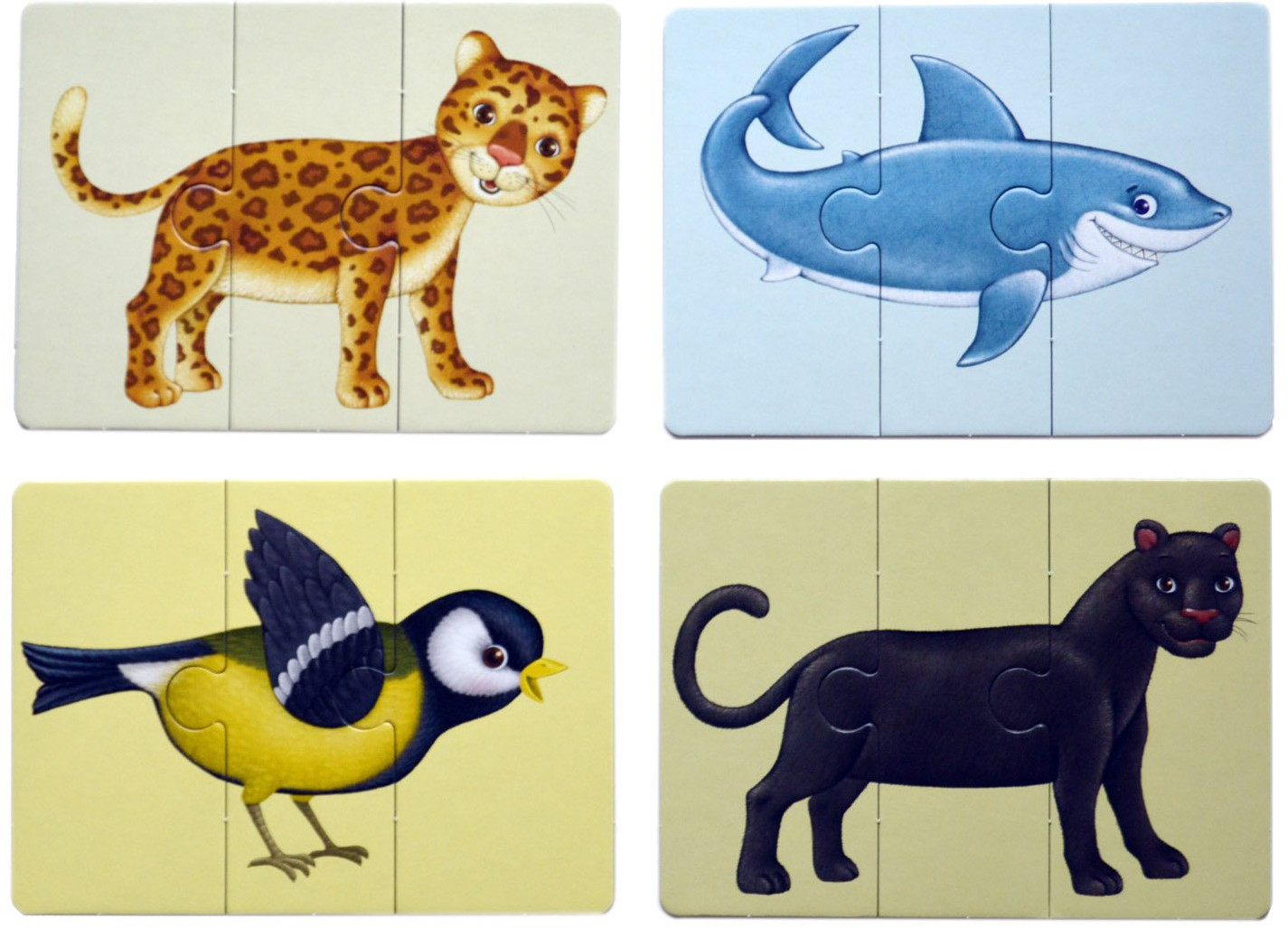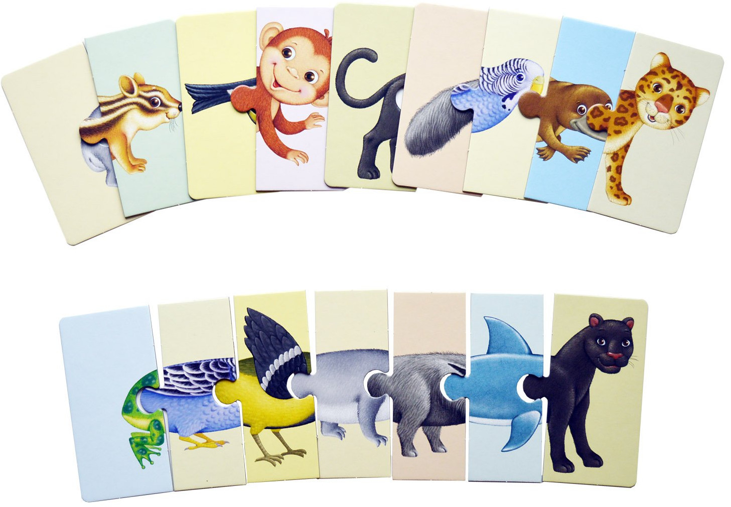 На оборотной стороне картинки вы соберете три изображения, ассоциативно связанных друг с другом. Все карточки-пазлы идеально стыкуются друг с другом, поэтому из них можно составлять смешных несуществующих животных!