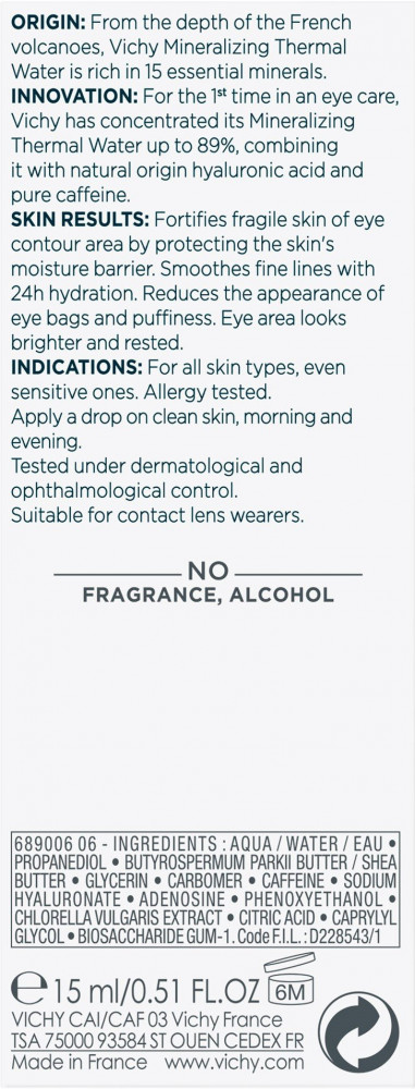 Vichy Mineral 89 Восстанавливающий и укрепляющий уход для кожи вокруг глаз-10% +131 лёгкая текстура хорошо увлажняет разглаживает морщинки экономный
