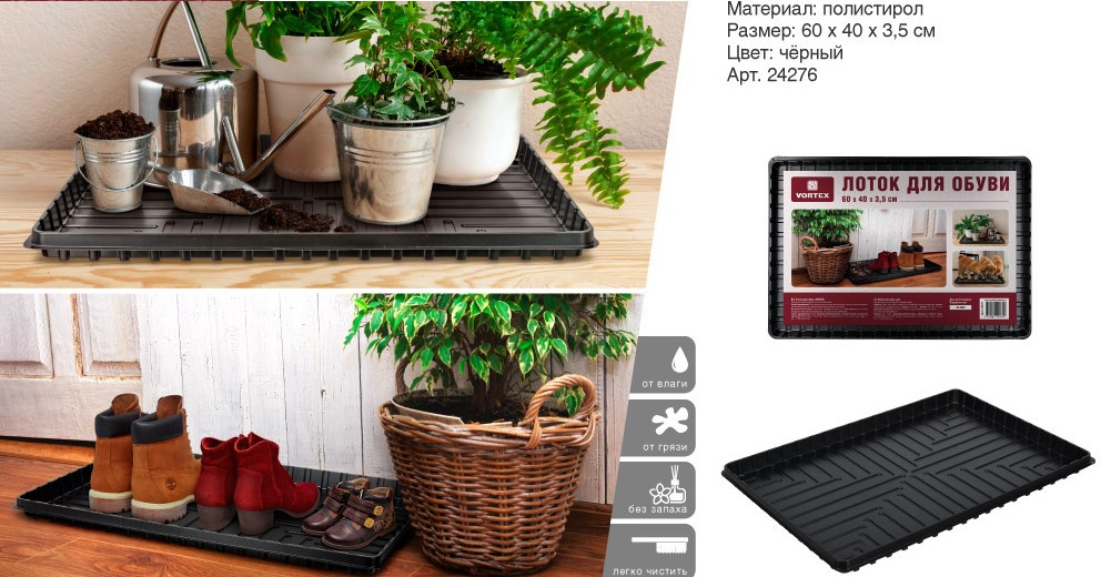 VORTEX Лоток для обувиВ данный момент этот товар отсутствует в продаже. Возможно, у нас найдется аналогичный или похожий товар здесь. Лоток используется как подставка для обуви, а так же в качестве поддона для растений, рассады и мисок для кормления домашних животных. |