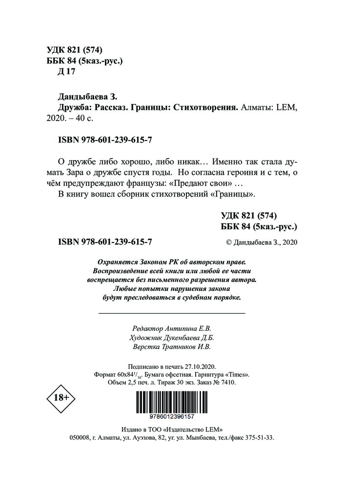 💳 Оплатить за товар можно при получении 🇰🇿 Есть бесплатная доставка по Казахстану 🎁 Копите бонусы с каждой покупки «О дружбе либо хорошо, либо никак... Именно так стала думать Зара о дружбе спустя годы. Но согласна героиня и с тем, о чём предупреждают французы: «Предают свои» ... В книгу вошел сборник стихотворений «Границы». |