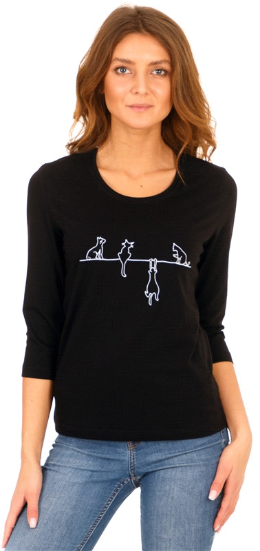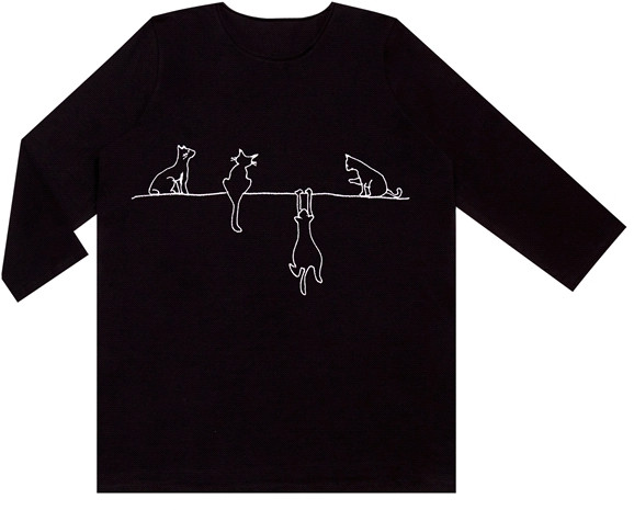 Приятный средней плотности трикотаж, рисунок вышитый (что выигрышно по сравнению с текстильным рисунком), на размер 48 хорошая слегка свободная посадка, красивый ворот. После стирки не растянулась.