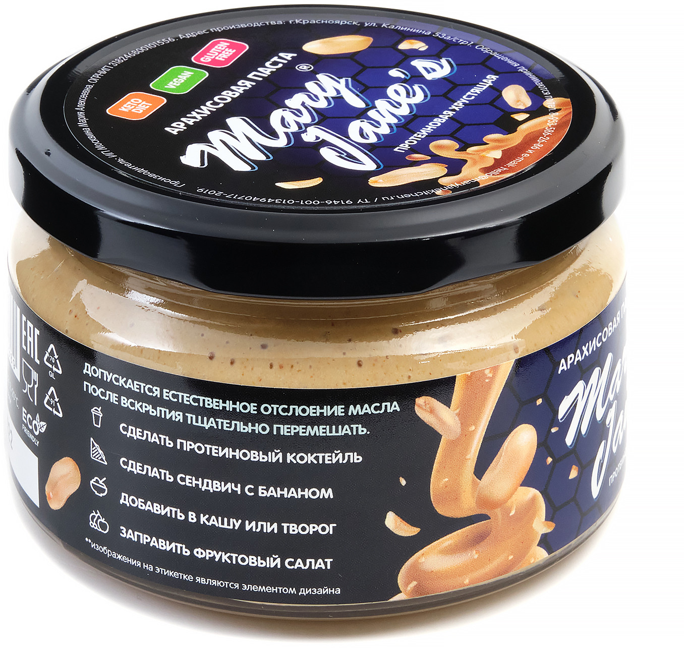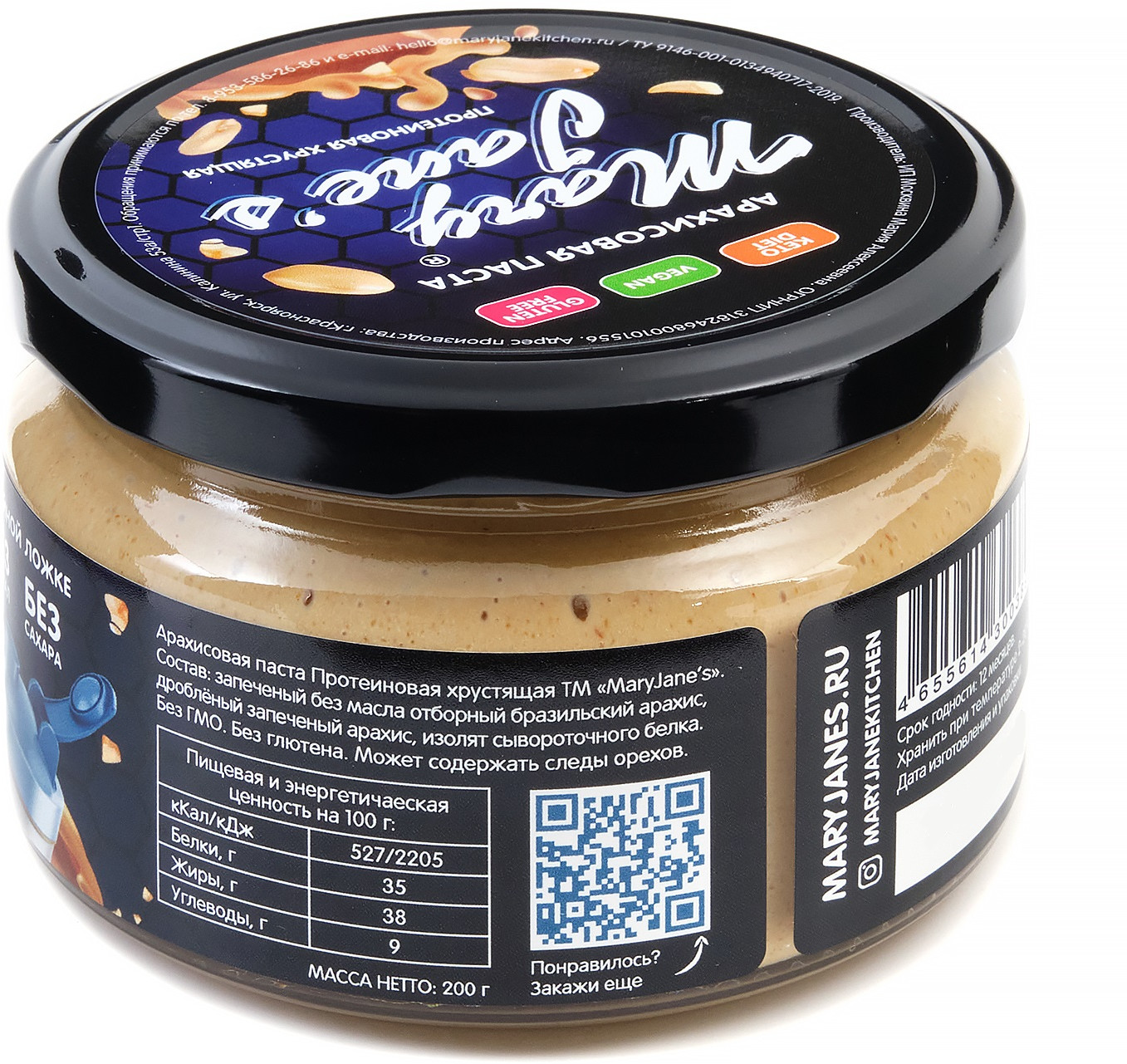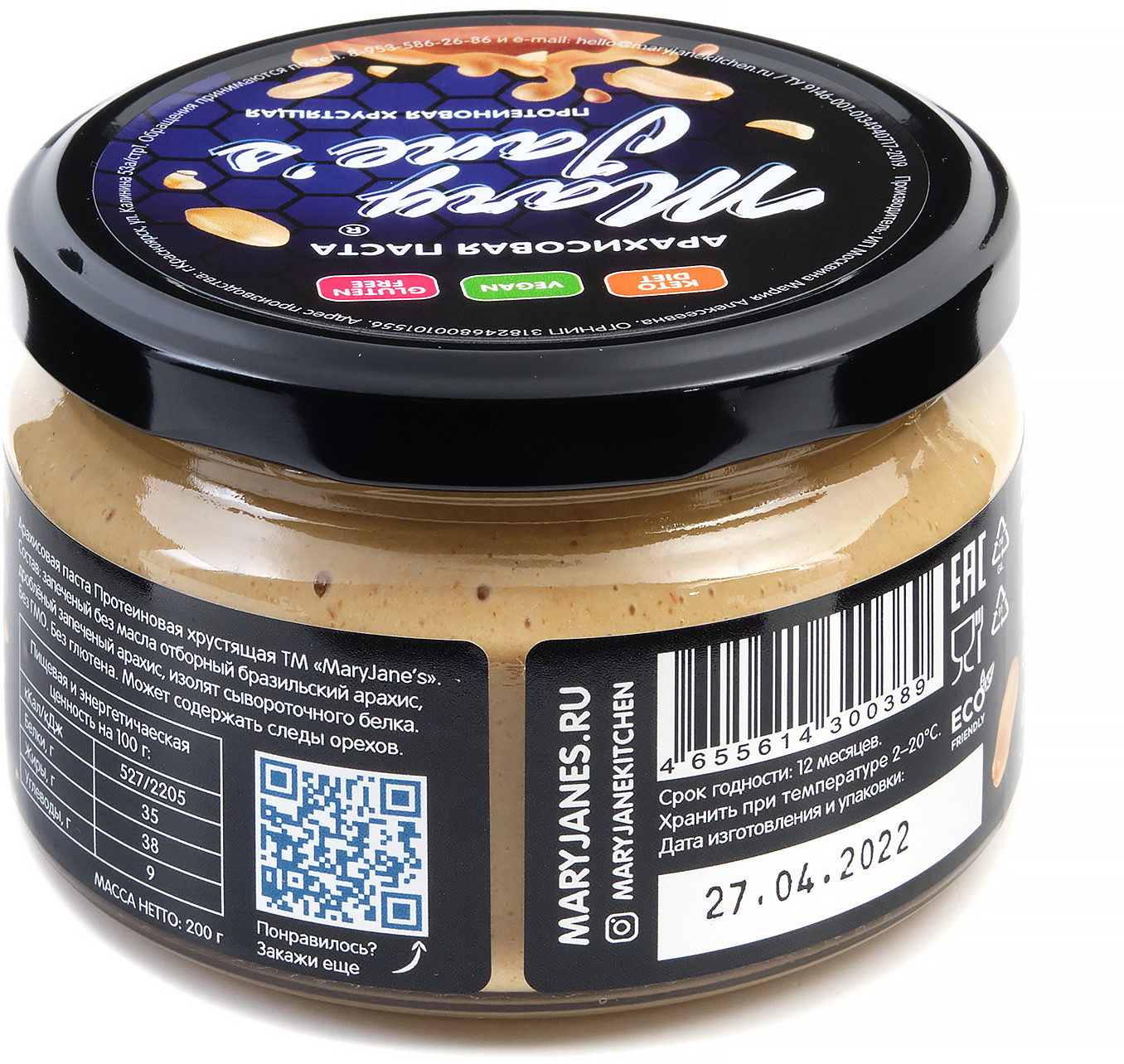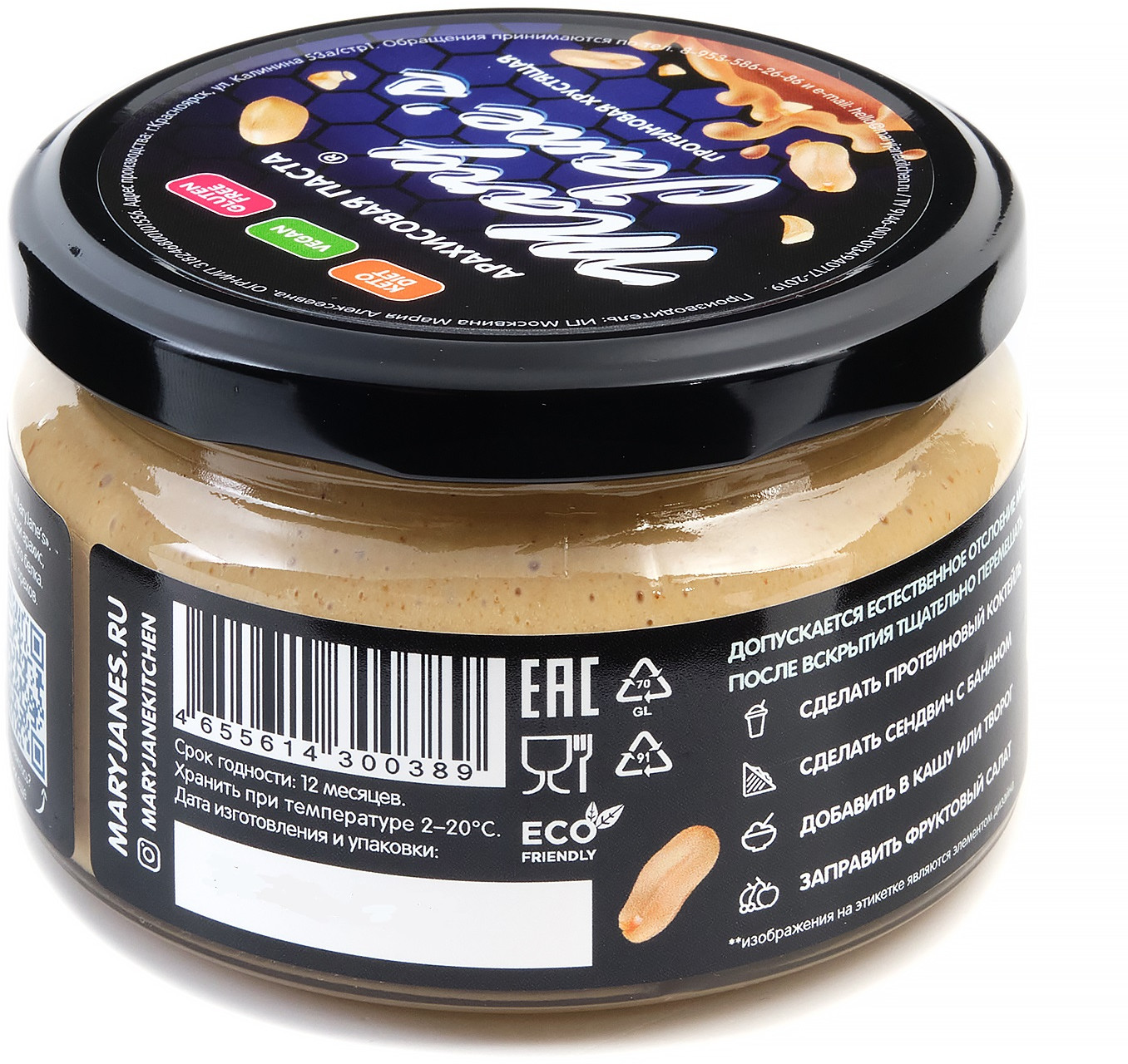 | Арахисовая паста Mary Jane’s Kitchen — без консервантов, наполнителей, подсластителей, эмульгаторов и других добавок или промышленных хитростей, имеет нежно-кремовую консистенцию и восхитительный натуральный вкус! Паста производится в Красноярске малыми партиями, только из свежих поставок сладких сортов арахиса, только из цельных орехов лучшего качества. |