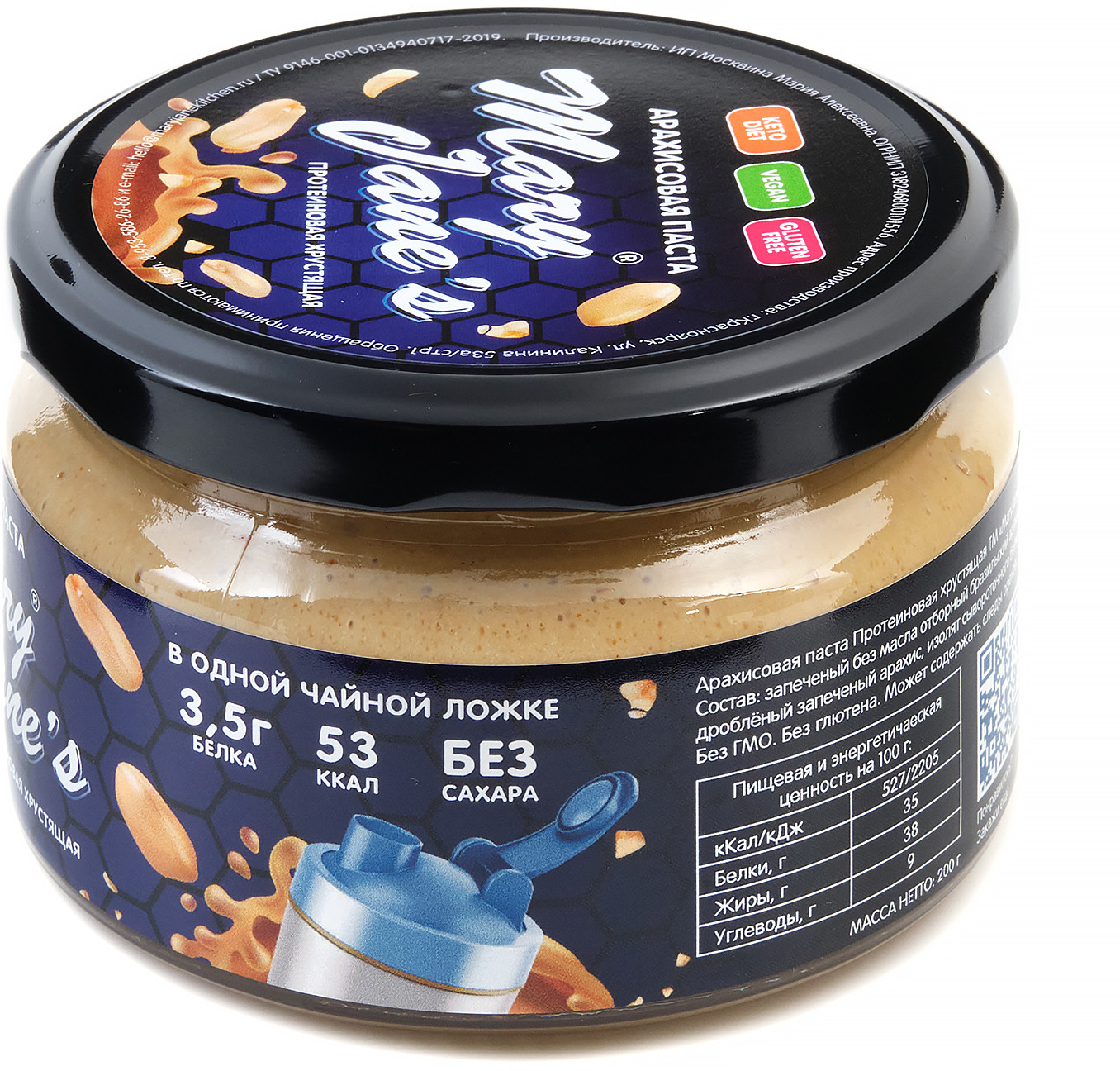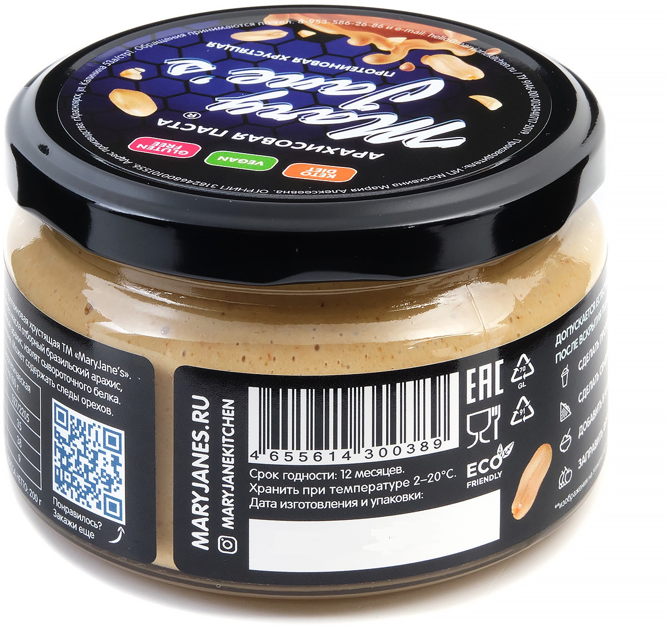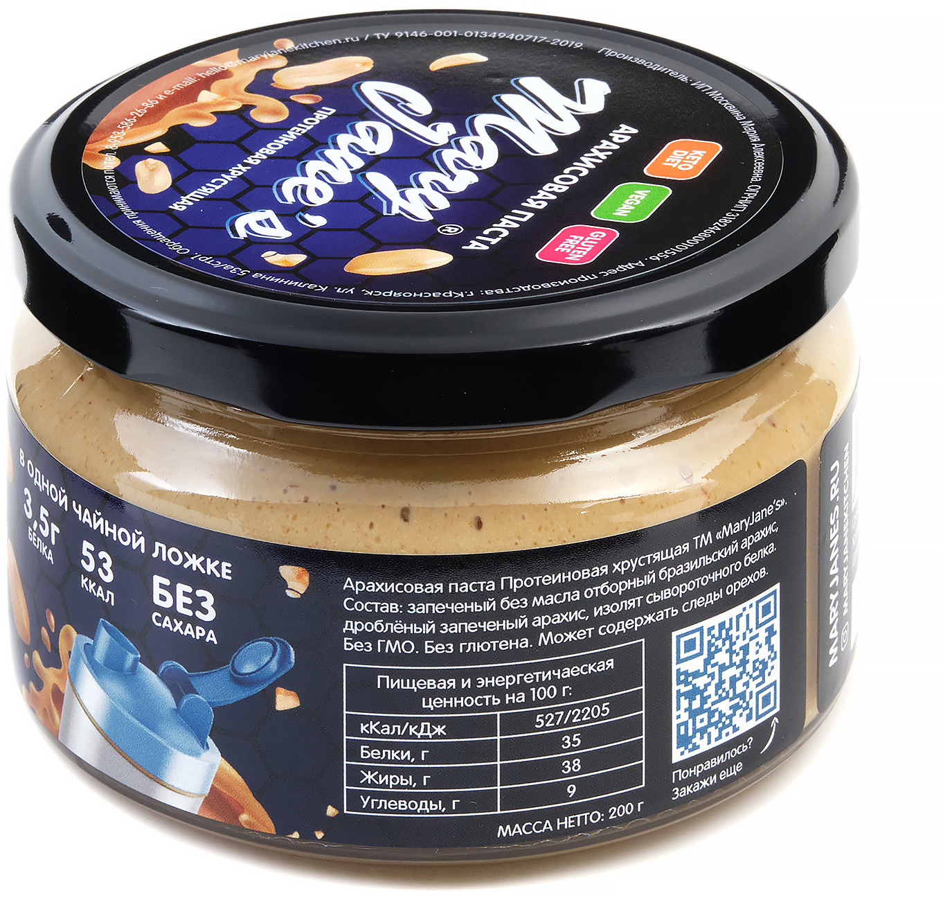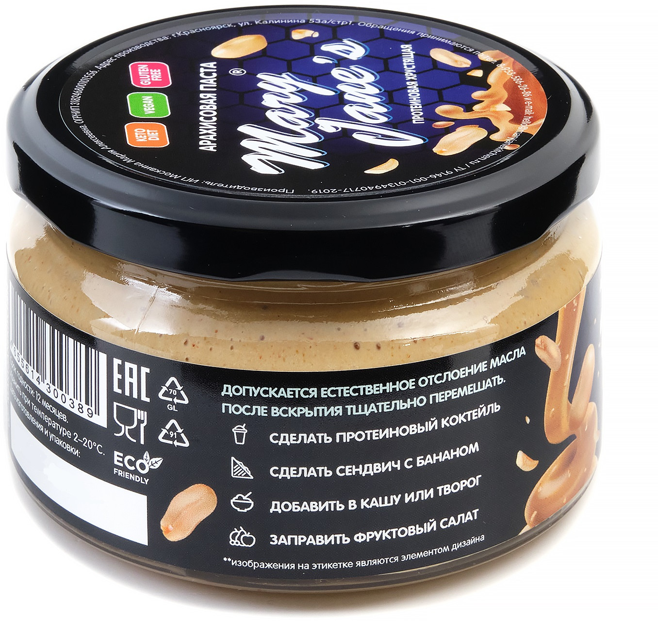 | Арахисовая паста Mary Jane’s Kitchen — без консервантов, наполнителей, подсластителей, эмульгаторов и других добавок или промышленных хитростей, имеет нежно-кремовую консистенцию и восхитительный натуральный вкус! Паста производится в Красноярске малыми партиями, только из свежих поставок сладких сортов арахиса, только из цельных орехов лучшего качества. |