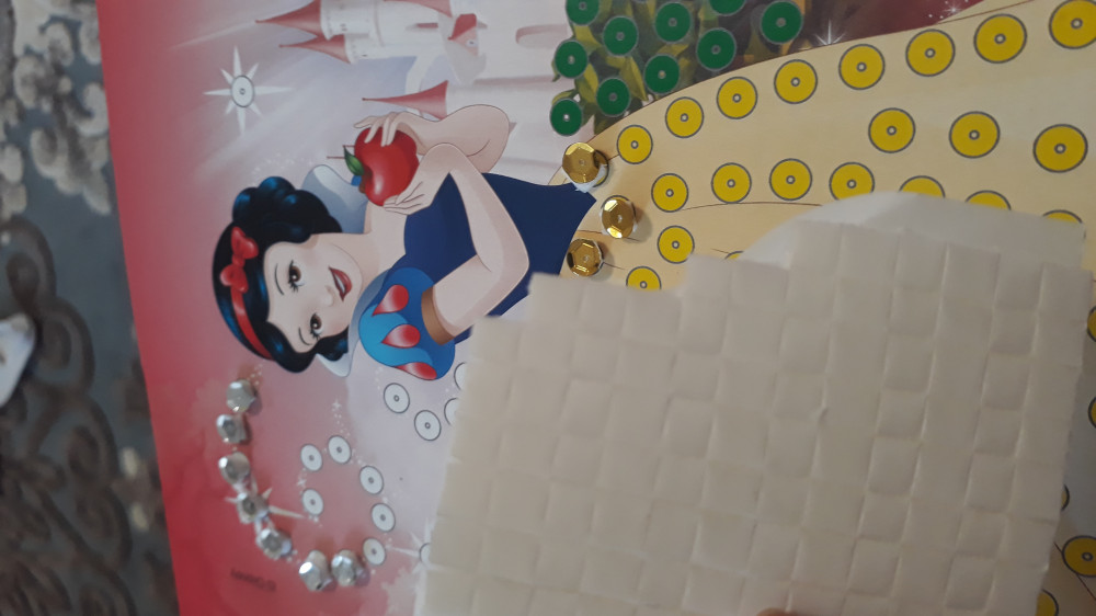 Ужасная клеющая основа белая. Не разрезана нормально. Прилипает к рукам и клейкая пленка вся на палец впивается. В общем такого ужаса я еще не видела)))) лучше купите клей и насаживайте каждую пайетку на картинку. Но это еще надо за клеем в магазин идти 🙄