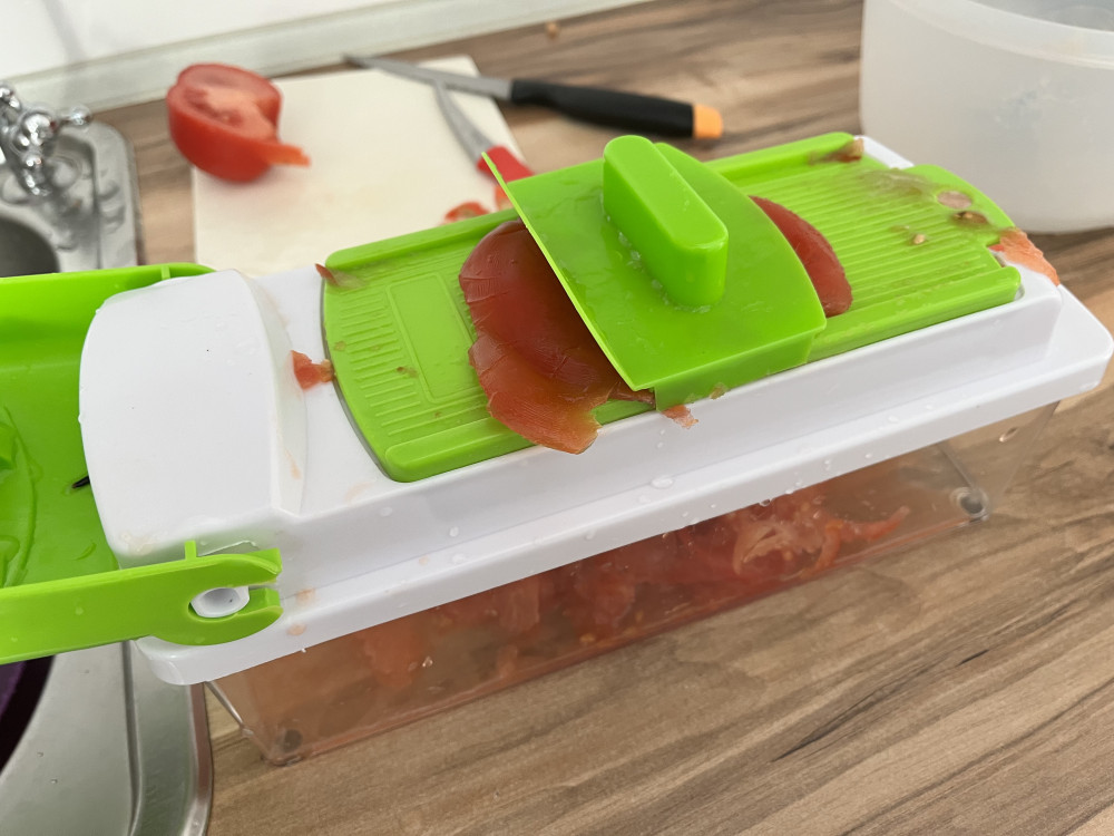 Одна знакомая сказала, что подобным хорошо шинковать лук для тұздық бешпармака. И действительно! Очень удобно шинкует, особенно удобно с помидорами: если вы любитель итальянской кухни, где в рецептах предлагают ошпарить кипятком и снять кожуру с помидора или натереть теркой, то этой овощерезкой все намного проще, быстрее и безопаснее. Болоньезе готовится очень быстро (натерла морковь, нашинковала лук и помидоры без кожуры). Использовать другие насадки не получилось. На вид они все же не для твёрдых овощей вообще, огурцы так и не получилось кубиками сделать. Может хорош для Оливье, но не тестировался.