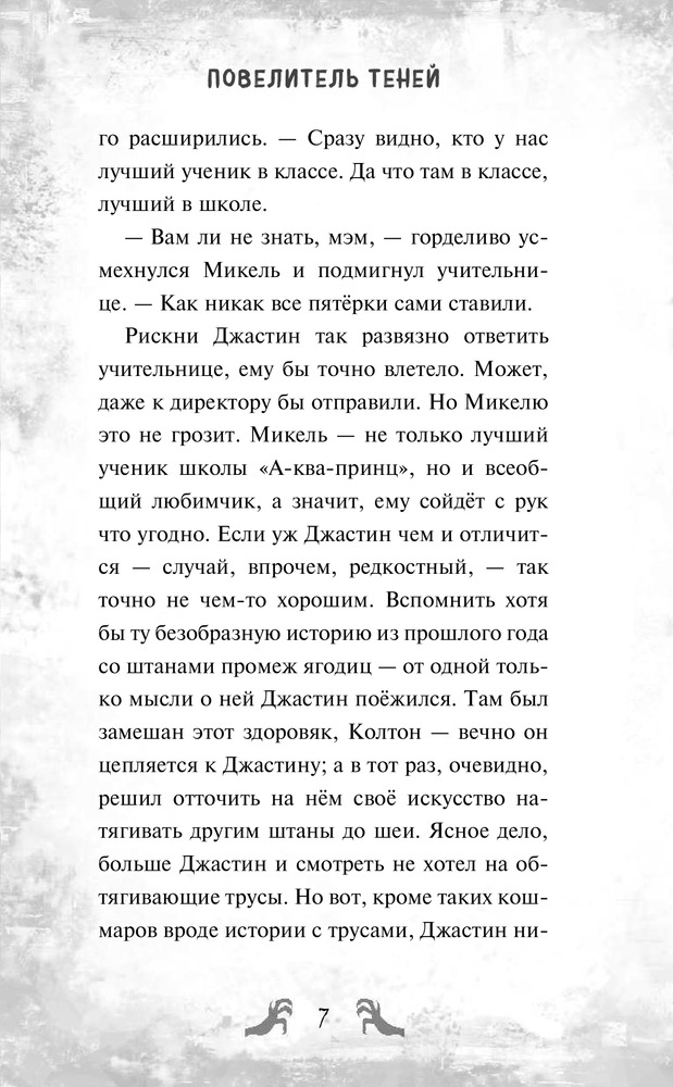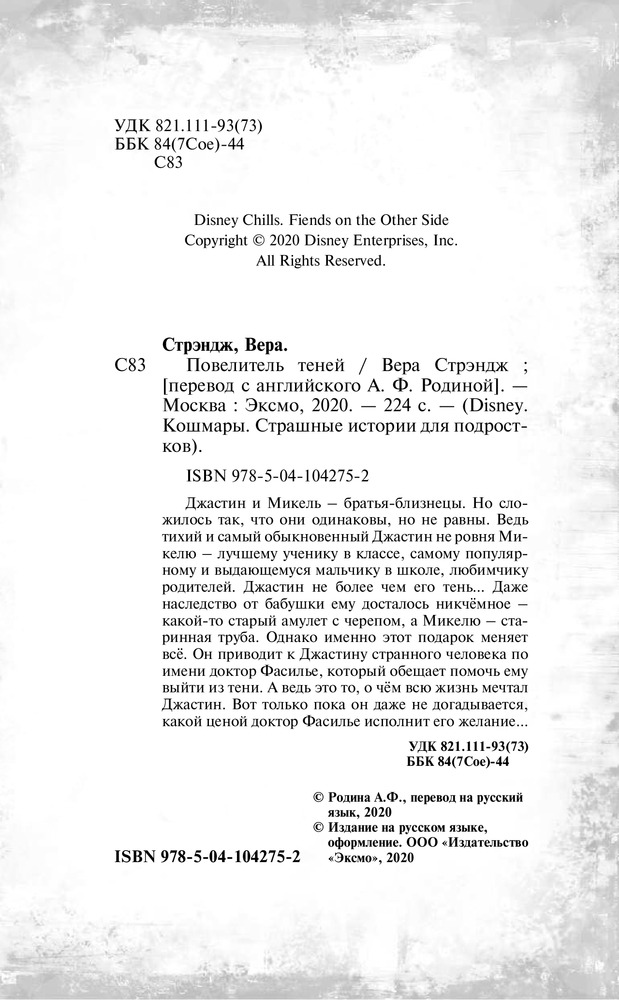 Повелитель тенейВ данный момент этот товар отсутствует в продаже. Возможно, у нас найдется аналогичный или похожий товар здесь. Серия: Disney. Кошмары. Страшные истории для подростков Джастин и Микель — братья-близнецы. Но сложилось так, что они одинаковы, но не равны. Ведь тихий и самый обыкновенный Джастин не ровня Микелю — лучшему ученику в классе, самому популярному и выдающемуся мальчику в школе, любимчику родителей. Джастин не более чем его тень... Даже наследство от бабушки ему досталось никчёмное — какой-то старый амулет с черепом, а Микелю — старинная труба. Однако именно этот подарок меняет всё. Он приводит к Джастину странного человека по имени доктор Фасилье, который обещает помочь ему выйти из тени. А ведь это то, о чём всю жизнь мечтал Джастин. Вот только пока он даже не догадывается, какой ценой доктор Фасилье исполнит его желание... |