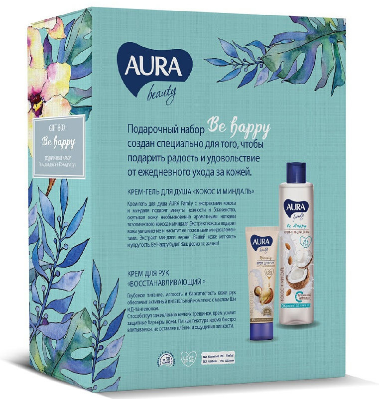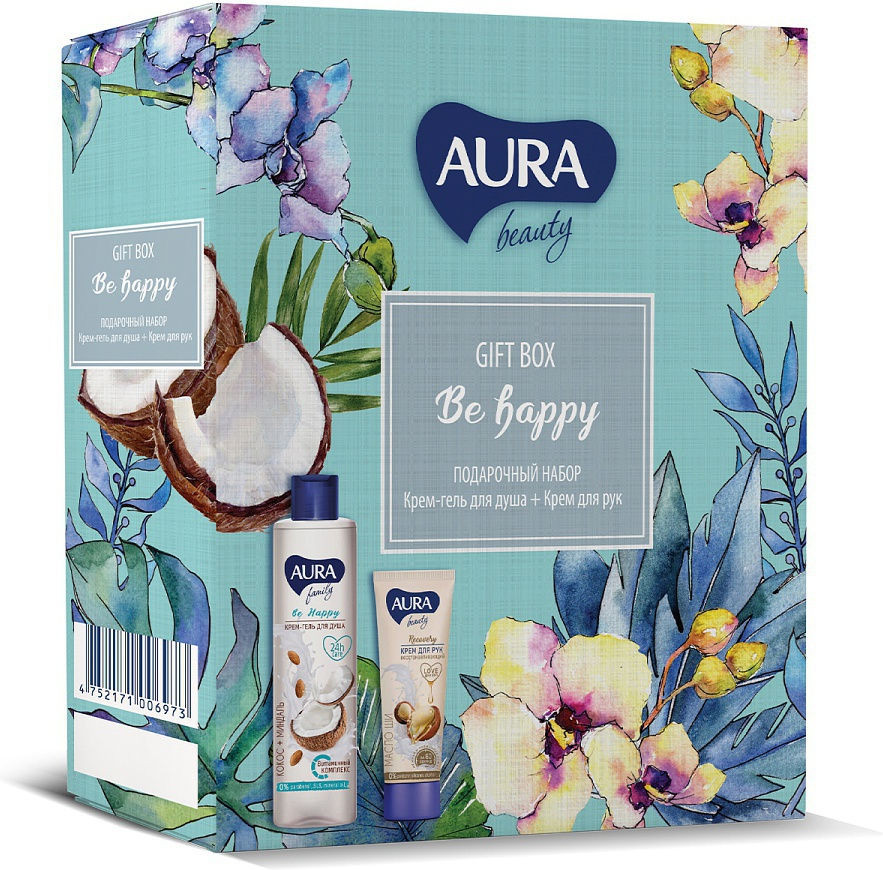 В набор входят: крем-гель для душа «Кокос и миндаль» 250 мл и крем для рук «Восстанавливающий» 75 мл.
