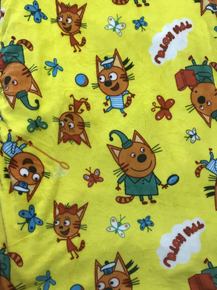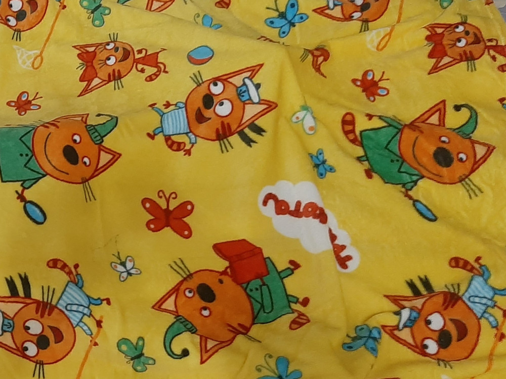 Плед мягкий, не сильно плотный, яркий. Покупала для крестницы в подарок, ей очень понравился плед, любит Три кота