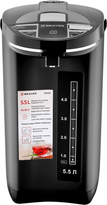 💳 Оплатить за товар можно при получении 🇰🇿 Есть бесплатная доставка по Казахстану от 1 дня 🎁 Копите бонусы с каждой покупки Термопот электрический Brayer — многофункциональный практичный прибор, позволяющий в любой момент вскипятить или подогреть воду, а также длительное время поддержать необходимую температуру воды в большом объёме. Возможность выбора температуры: 45/55/65/85/98 °С. Максимальный объем 5,5 л. Корпус из нержавеющей стали. Внутренняя колба из высококачественной нержавеющей стали. LCD-дисплей отображает температуру нагрева воды. 2 режима подачи воды: автоматическая и нажатием чашкой на клапан. |