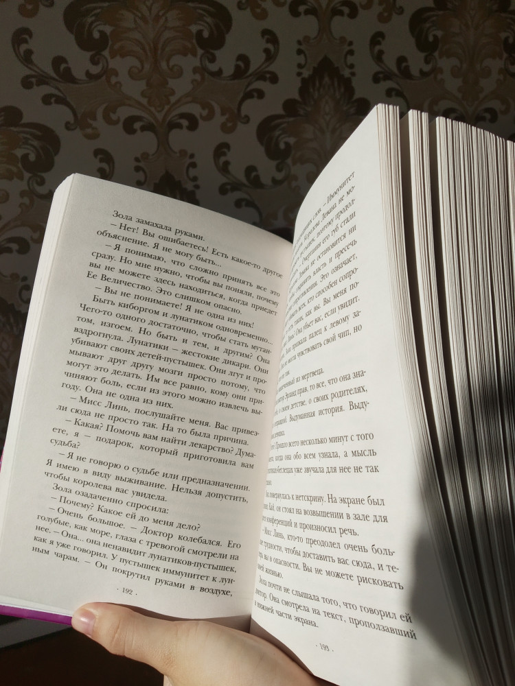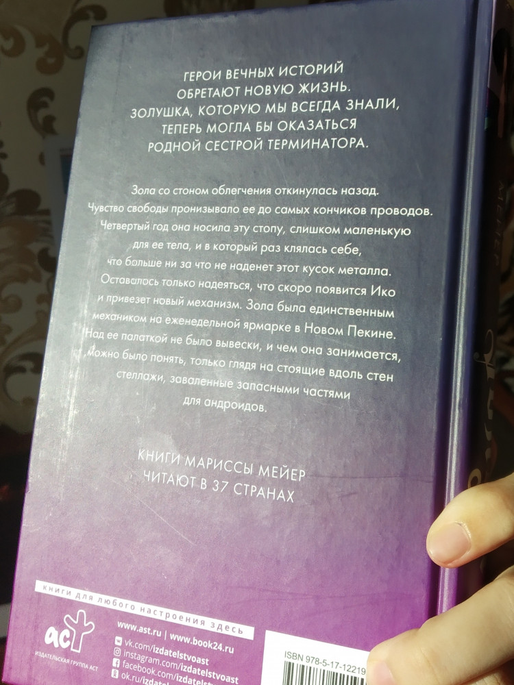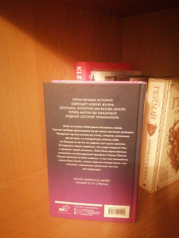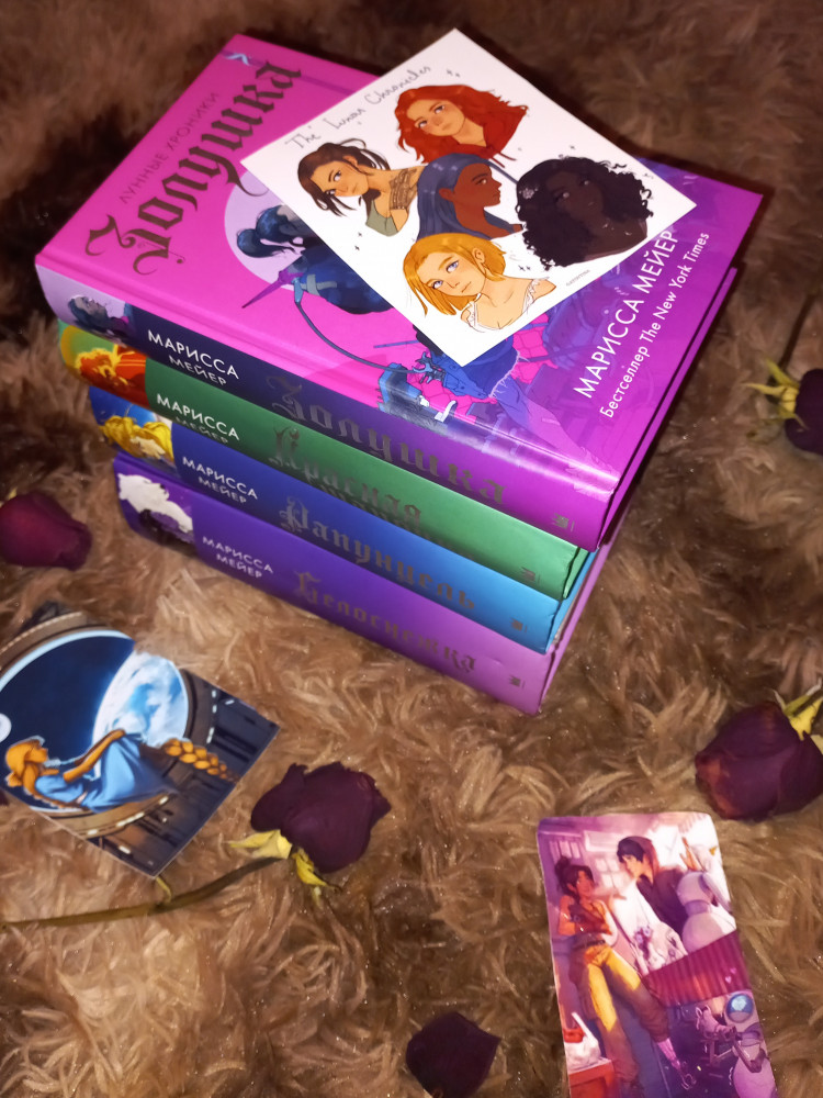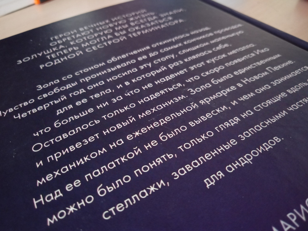 Перед нами ретеллинг знакомой всем с детства сказки Золушка. Здесь есть и приёмная девушка, злая мачеха, сводные сёстры и принц. Но здесь не всё так просто. Все действия происходят в будущем, где есть андроиды, киборги, заселенная Луна и ужасная болезнь. Да и сама Золушка не совсем привычная нам девушка. Линь Зола — не человек, а киборг. На удивление мне понравилась главная героиня. Да, у неё были и глупые поступки, но Зола очень ответственная и благоразумная девушка. Это очень легкая и приятная история. Здесь нет штамповых моментов, а своя история с войной между Луной и Землей, между чумой и людьми. За событиями было очень интересно наблюдать. Эта история точно вошла в топ моих любимых книг.