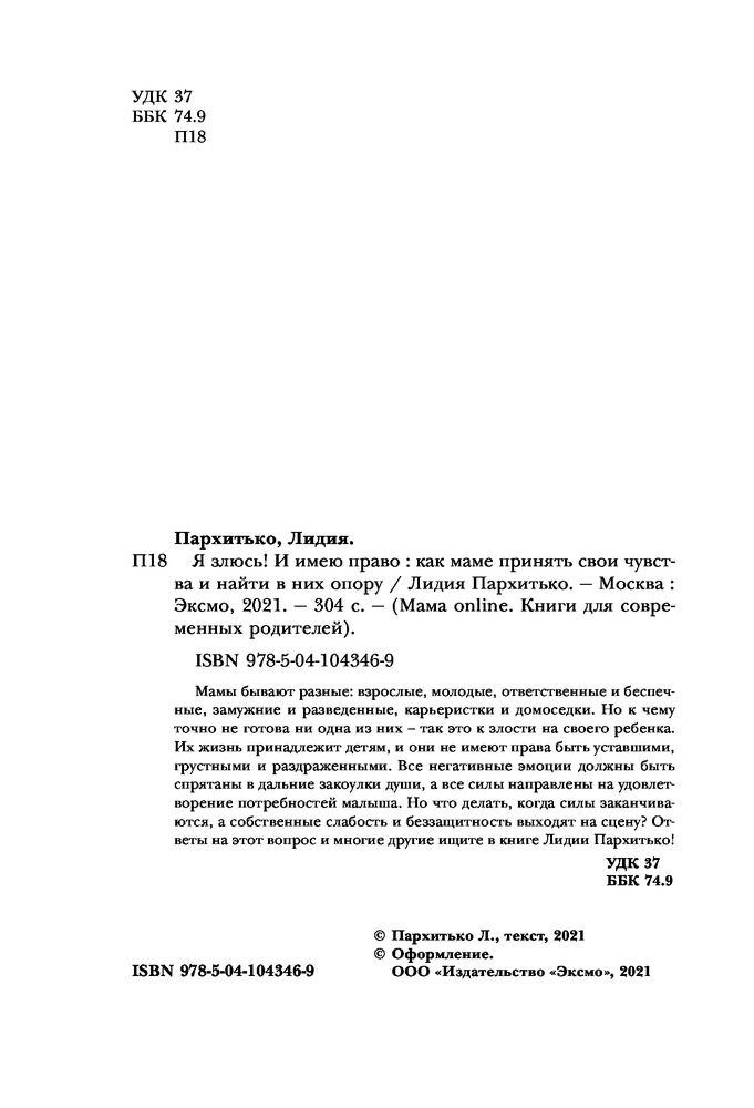 💳 Оплатить за товар можно при получении 🇰🇿 Есть бесплатная доставка по Казахстану от 1 дня 🎁 Копите бонусы с каждой покупки Мамы бывают разные: взрослые, молодые, ответственные и беспечные, замужние и разведенные, карьеристки и домоседки. Но к чему точно не готова ни одна из них — так это к злости на своего ребенка. Их жизнь принадлежит детям, и они не имеют права быть уставшими, грустными и раздраженными. Все негативные эмоции должны быть спрятаны в дальние закоулки души, а все силы направлена на удовлетворение потребностей малыша. Но что делать, когда силы заканчиваются, а собственные слабость и беззащитность выходят на сцену? Ответы на этот вопрос и многие другие ищите в книге Лидии Пархитько! |