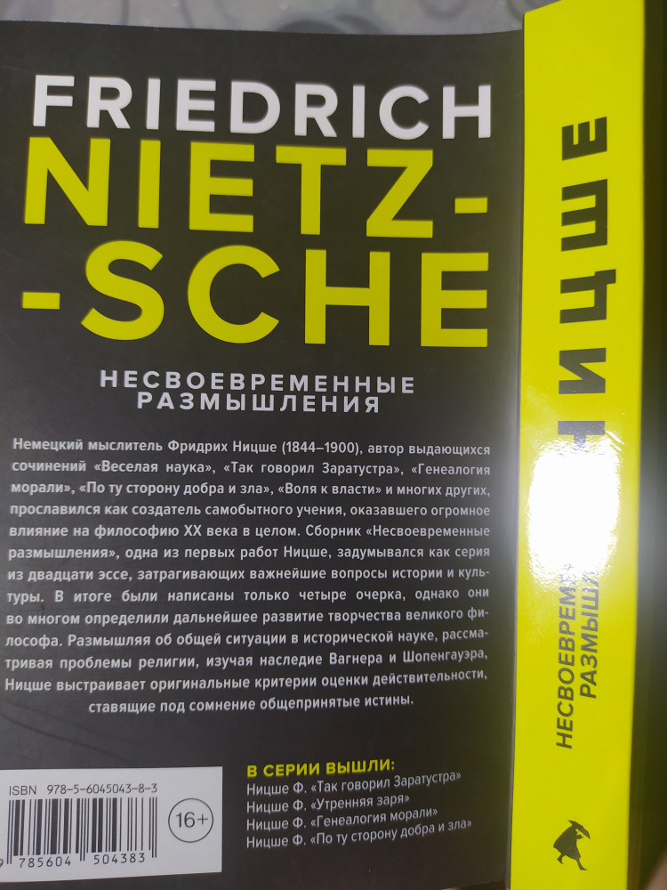 У этой серии неожиданно очень приятное оформление; хотя они и в мягком переплёте, но на полке выглядят прекрасно, и в руках очень приятно держать. И шрифт достаточно большой, читается отлично. Что касается содержания конкретно этого издания, все четыре входящих в него эссе весьма небезынтересны, но лично я выделил бы третье: "Шопенгауэр как воспитатель". — Для меня, как почитателя Шопенгауэра, этот текст значит очень много. Спасибо flip
