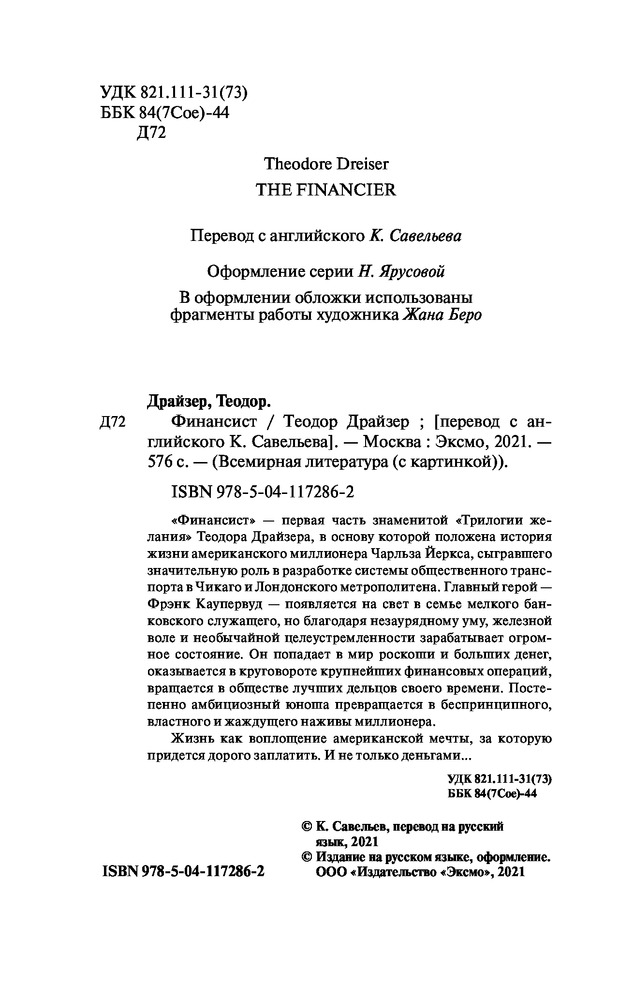 💳 Оплатить за товар можно при получении 🇰🇿 Есть бесплатная доставка по Казахстану от 1 дня 🎁 Копите бонусы с каждой покупки Серия: Всемирная литература (новое оформление) «Финансист» — первая часть знаменитой «Трилогии желания» Теодора Драйзера, в основу которой положена история жизни американского миллионера Чарльза Йеркса, сыгравшего значительную роль в разработке системы общественного транспорта в Чикаго и Лондонского метрополитена. Главный герой — Фрэнк Каупервуд — появляется на свет в семье мелкого банковского служащего, но благодаря незаурядному уму, железной воле и необычайной целеустремленности зарабатывает огромное состояние. Он попадает в мир роскоши и больших денег, оказывается в круговороте крупнейших финансовых операций, вращается в обществе лучших дельцов своего времени. Постепенно амбициозный юноша превращается в беспринципного, властного и жаждущего наживы миллионера. |
