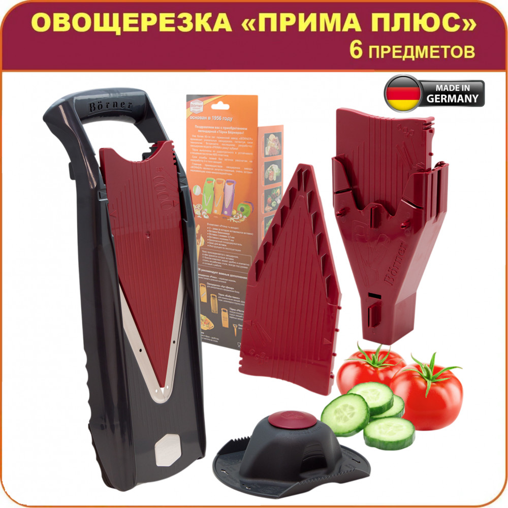 Первый комплект (это был Тренд) купила в Германии в 2011 году. И пользуюсь ей до сих пор без проблем! Не знаю, как я раньше без нее обходилась. Салаты, картофель фри или слайсами, нарезка для супов борща, драники, овощные оладьи, капуста для засолки, овощное/фруктовое пюре для малыша, красивая нарезка фруктов для праздничного стола и пр. - все только с Börner! Докупила здесь разные дополнительные варианты тёрок. Сейчас очень удобно - можно посмотреть как правильно работать тёркой и разными насадками на YouTube (Borner RUS). Эту "Приму" купила в подарок подруге. Отлично, что на сайте можно приобрести различные дополнения к набору. Спасибо.