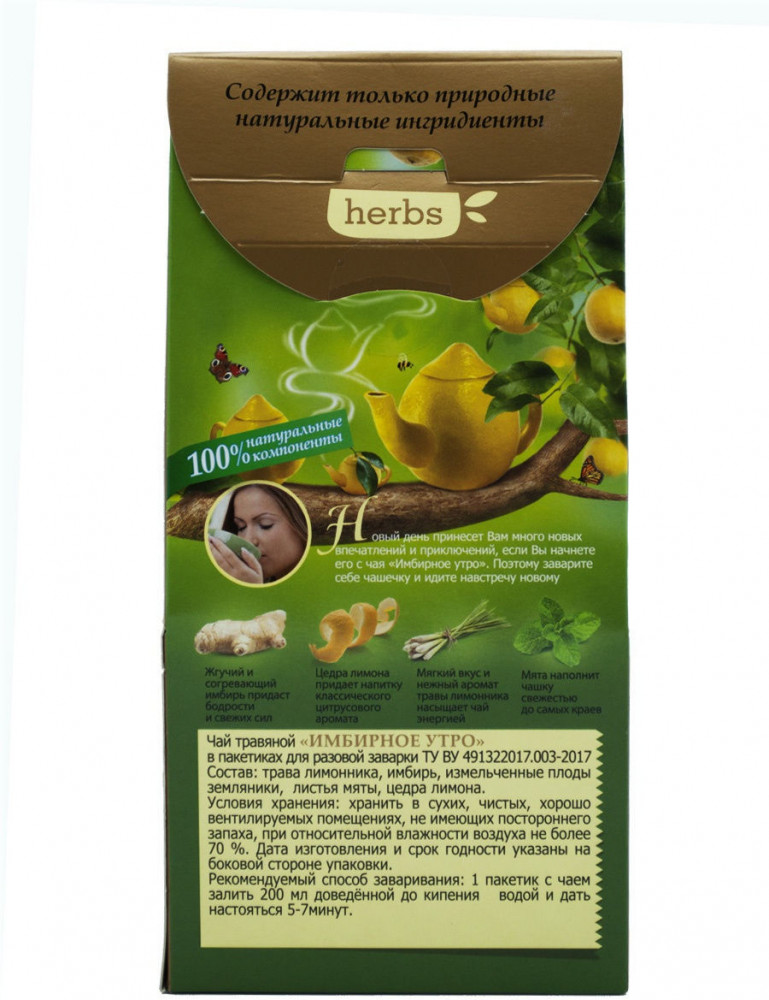 Lovare Чай «Имбирное утро»В данный момент этот товар отсутствует в продаже. Возможно, у нас найдется аналогичный или похожий товар здесь. «Имбирное утро» — смесь чая травяного и ягодного с имбирем и цедрой лимона. Новый день принесет много новых впечатлений и приключений, если вы начнете его с «Имбирного утра». |