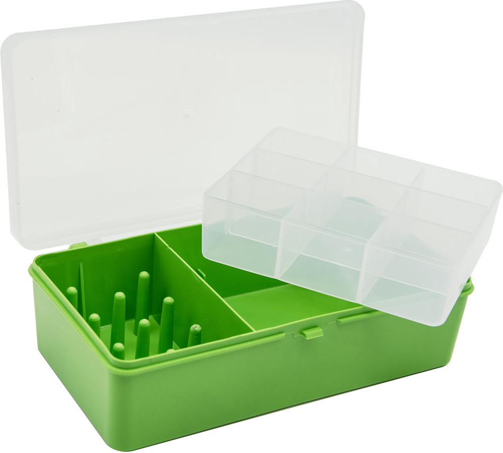 Коробка для организованного хранения швейных принадлежностей. В коробке — 9 держателей для катушек, а также вкладыш из прозрачного пластика с 9 ячейками. Такой контейнер поможет держать вещи в порядке. Контейнер для организованного хранения бисера, стекляруса, бусин, пуговиц, фурнитуры и других мелочей.