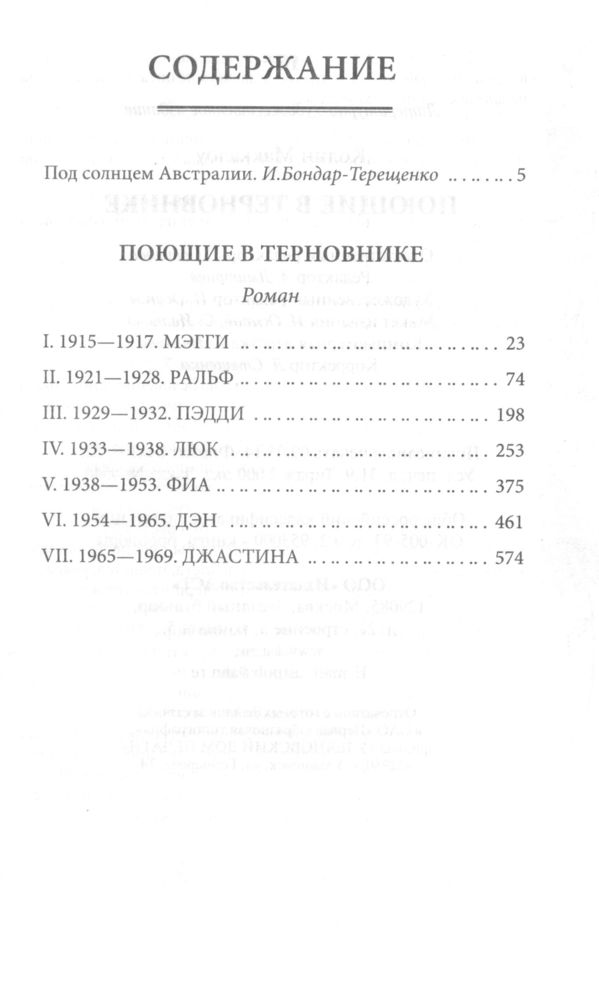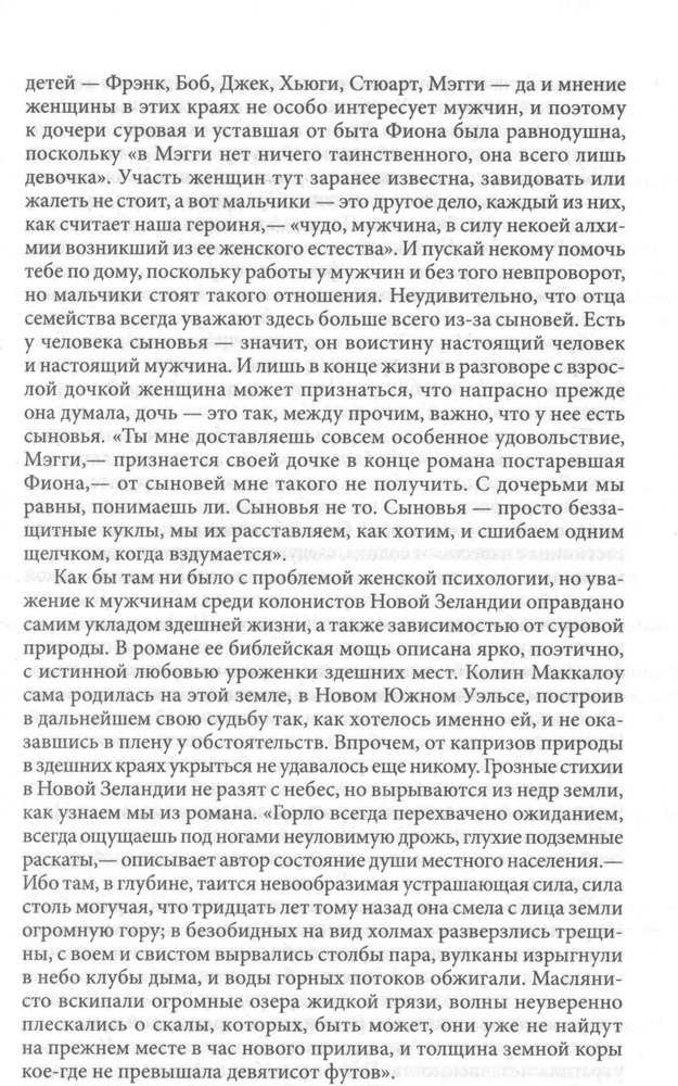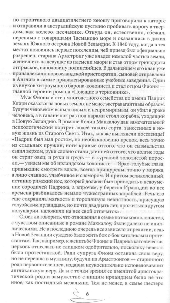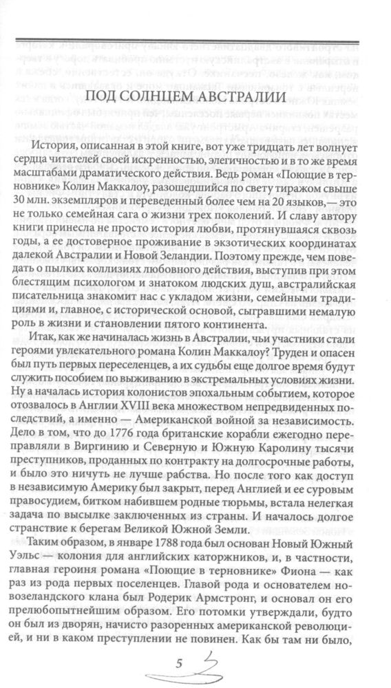 «Поющие в терновнике» — захватывающий роман, уникальный во всех отношениях. Эта книга принесла мировую известность бывшему преподавателю нейропсихологии, австралийской писательнице Колин Маккалоу: многомиллионные тиражи, успешная экранизация, неувядающая популярность на протяжении трех десятилетий.