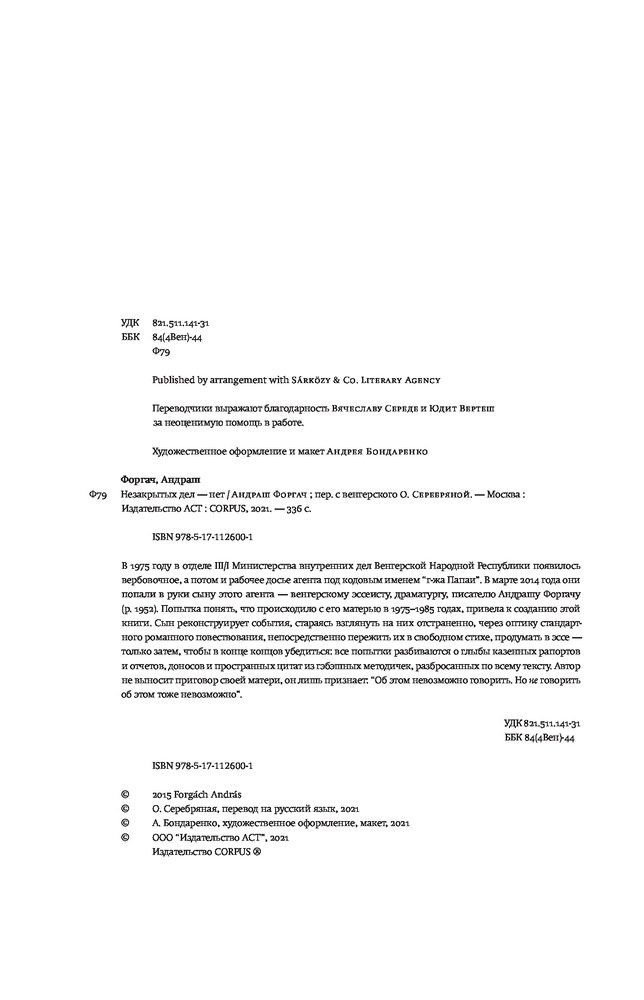 Незакрытых дел — нетВ данный момент этот товар отсутствует в продаже. Возможно, у нас найдется аналогичный или похожий товар здесь. Серия: memoria Венгерский литератор Андраш Форгач случайно узнает, что в 1970–1980-х годах его давно покойная мать сотрудничала с госбезопасностью. Получив ее рабочее досье, он обнаруживает, что мать и его предлагала органам в качестве сотрудника и что именно она помогла спецслужбам установить жучки у него в квартире. Он негодует, плачет, бунтует против изменившегося в одночасье прошлого — и пишет книгу в попытке понять и свое отношение к матери, и мир вокруг. |
