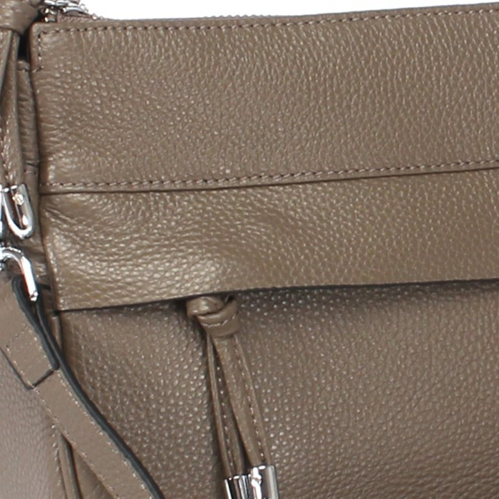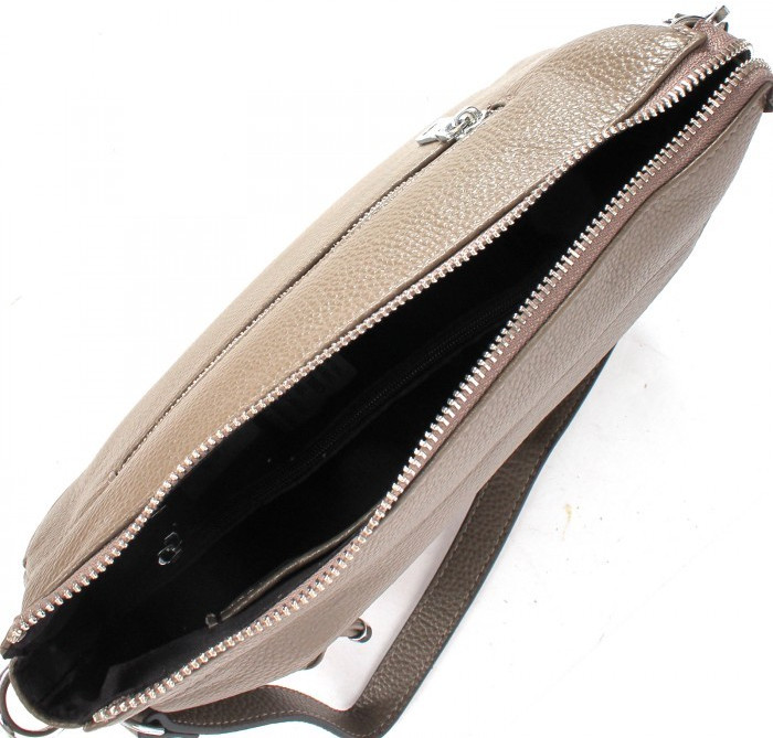 Покупка порадовала! Спасибо! Уточнения и дополнения к описанию: Наружных кармана всего 2, расположены с разных сторон сумки, оба закрываются на металлические молнии. Карман с внешней стороны спрятан под клапаном, замок легко находится благодаря декоративному брелоку. Имеются съемные ручка и плечевой ремень. Ремень с изнанки выполнен из синтетической тесьмы, в цвет коже (у меня - черная), достаточно мягкий.