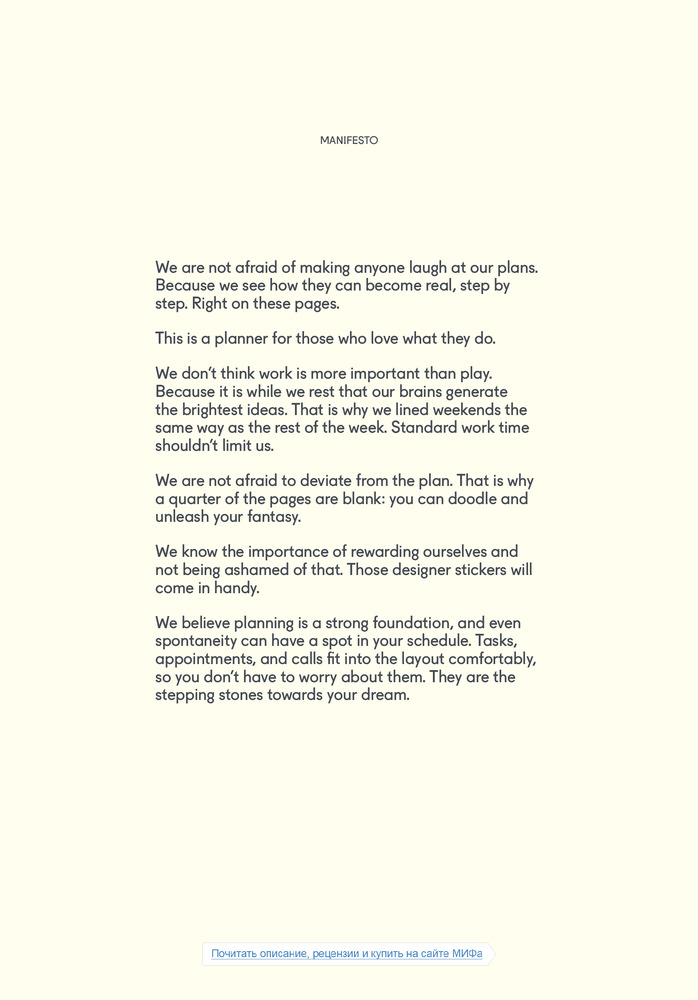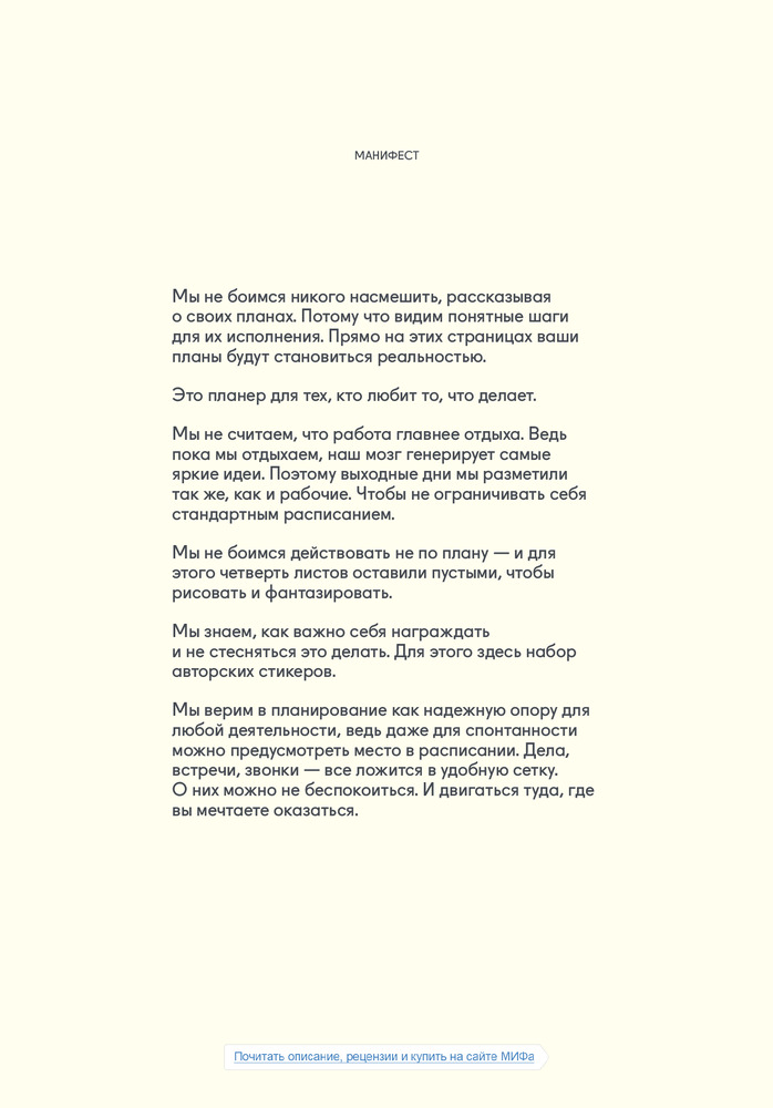 Планер для тех, кто любит то, что делает. Обложка с черными оваламиВ данный момент этот товар отсутствует в продаже. Возможно, у нас найдется аналогичный или похожий товар здесь. Серия: Бизнес Мы не боимся никого насмешить, рассказывая о своих планах. Потому что видим понятные шаги для их исполнения. Прямо на этих страницах ваши планы будут становиться реальностью. |
