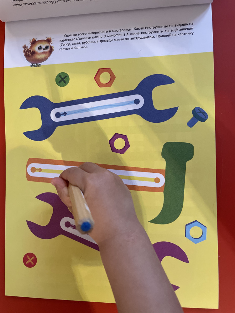 Мы рекомендуем малышам сначала обводить линии несколько раз указательным пальчиком. Затем можно переходить ко второму этапу и обводить линии простым карандашом. Мы рекомендуем использовать простой карандаш. Не ручку, не фломастер, а именно простой карандаш, потому что его легко стереть и попросить ребёнка нарисовать линию снова. Малыш будет чувствовать себя увереннее, так как он будет понимать, что у него есть возможность провести линию несколько раз и добиться наилучшего результата своей работы. Используйте мягкий карандаш — он меньше продавливает бумагу и его легче стереть. Не забывайте следить, чтобы ваш маленький ученик правильно держал карандаш. Если заламинировать страницы книги широким прозрачным скотчем или вложить их в файлы, то можно предложить малышу рисовать фломастером. Фломастер легко стирается с плёнки влажной тряпочкой, поэтому можно будет проводить линии снова и снова, добиваясь идеального результата. Так книга превратится в тренажёр многоразового использования.