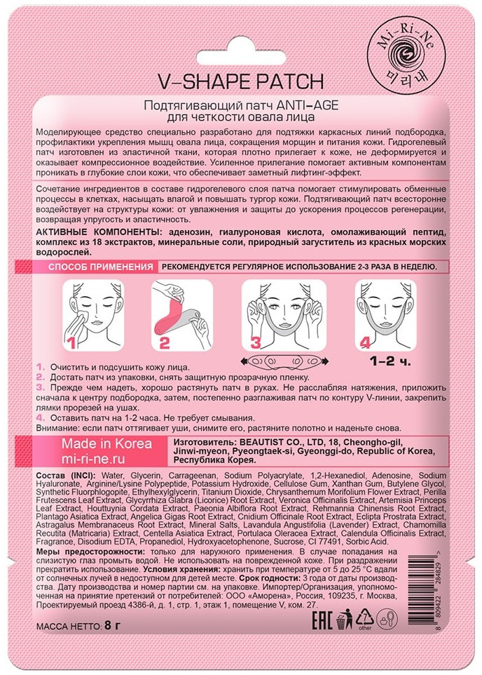 Mi-Ri-Ne Патчи для лица подтягивающие «V-Shape»В данный момент этот товар отсутствует в продаже. Возможно, у нас найдется аналогичный или похожий товар здесь. Моделирующее средство специально разработано для подтяжки каркасных линий подбородка, профилактики укрепления мышц овала лица, сокращения морщин и питания кожи. Гидрогелевый патч изготовлен из эластичной ткани, которая плотно прилегает к коже, не деформируется и оказывает компрессионное воздействие. Усиленное прилегание помогает активным компонентам проникать в глубокие слои кожи, что обеспечивает заметный лифтинг-эффект. Сочетание ингредиентов в составе гидрогелевого слоя патча помогает стимулировать обменные процессы в клетках, насыщать влагой и повышать тургор кожи. Подтягивающий патч всесторонне воздействует на структуры кожи: от увлажнения и защиты до ускорения процессов регенерации, возвращая упругость и эластичность. |