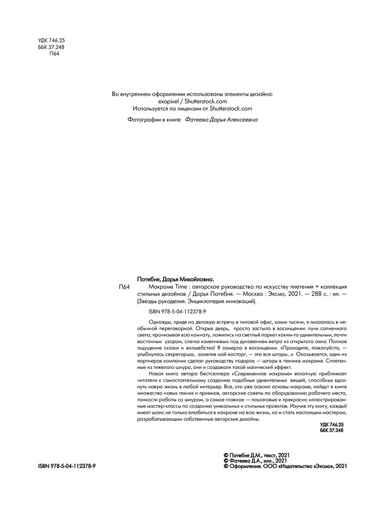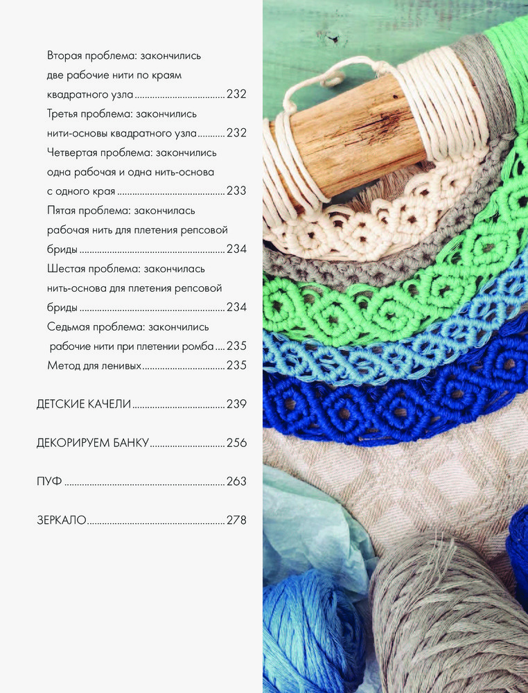 Макраме Time. Авторское руководство по искусству плетения. Коллекция стильных дизайновпонятные пояснения крупные фото много нового В данный момент этот товар отсутствует в продаже. Возможно, у нас найдется аналогичный или похожий товар здесь. Серия: Звезды рукоделия. Энциклопедия инноваций Однажды, придя на деловую встречу в типовой офис, каких тысячи, я оказалась в необычной переговорной. Открыв дверь, просто застыла в восхищении: лучи солнечного света, пронизывая всю комнату, ложились на светлый паркет каким-то удивительным, почти восточным узором, слегка изменчивым под дуновением ветра из открытого окна. Полное ощущение сказки и волшебства! Я замерла в восхищении. — Проходите, пожалуйста, — улыбнулась секретарша, заметив мой восторг,- это все шторы... Оказывается, один из партнеров компании сделал руководству подарок — шторы в технике макраме. Сплетенные из тяжелого шнура, они и создавали такой магический эффект. |