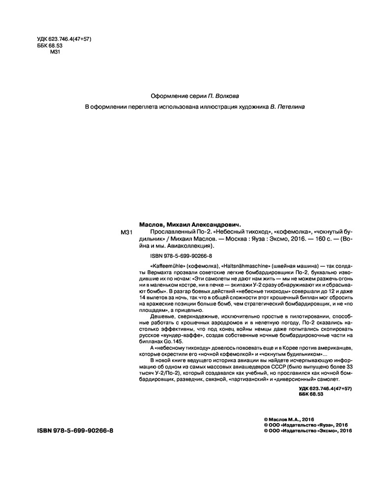 Прославленный По-2. «Небесный тихоход», «кофемолка», «чокнутый будильник»В данный момент этот товар отсутствует в продаже. Возможно, у нас найдется аналогичный или похожий товар здесь. Серия: Война и мы. Авиаколлекция «Kaffeemühle» (кофемолка), «Нaltsnähmaschine» (швейная машина) — так солдаты Вермахта прозвали советские легкие бомбардировщики По-2, буквально изводившие их по ночам: «Эти самолеты не дают нам жить — мы не можем разжечь огонь ни в маленьком костре, ни в печке — экипажи У-2 сразу обнаруживают их и сбрасывают бомбы». В разгар боевых действий «небесные тихоходы» совершали до 12 и даже 14 вылетов за ночь, так что в общей сложности этот крошечный биплан мог сбросить на вражеские позиции больше бомб, чем стратегический бомбардировщик, и не «по площадям», а прицельно. |