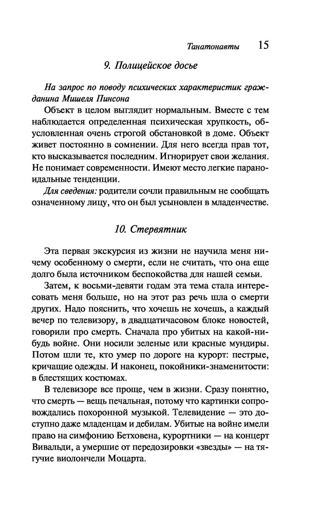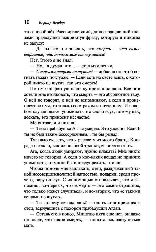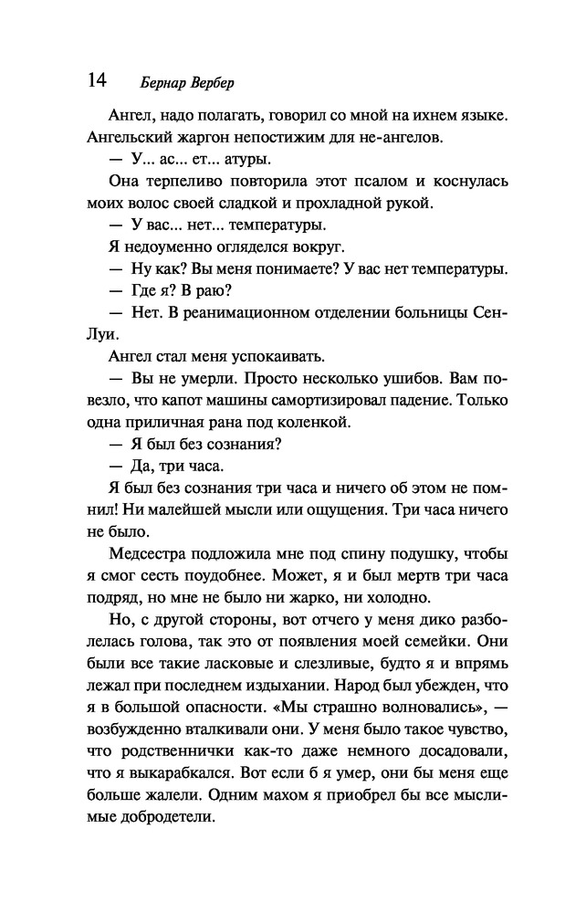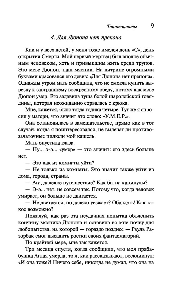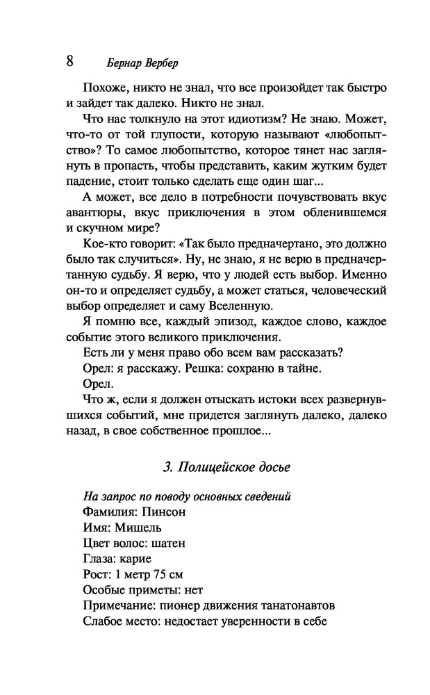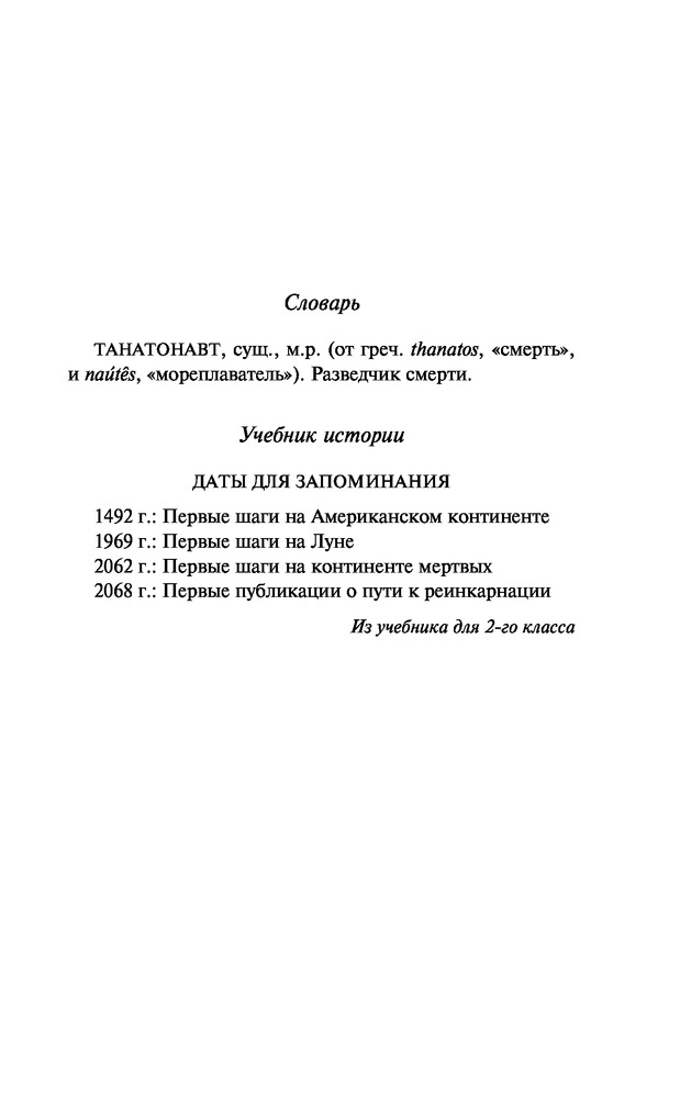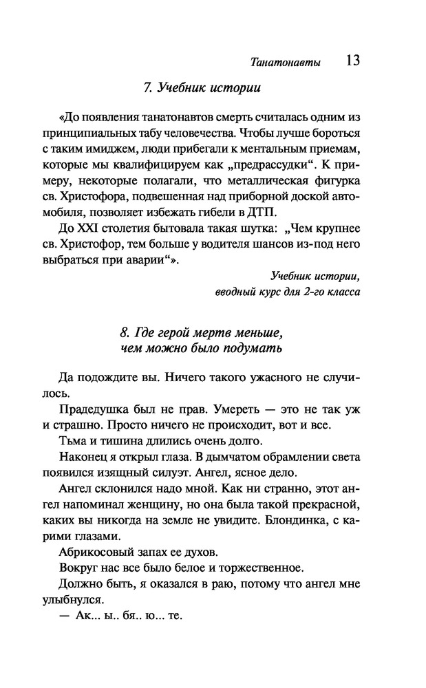 ТанатонавтыВ данный момент этот товар отсутствует в продаже. Возможно, у нас найдется аналогичный или похожий товар здесь. Серия: Бесконечная вселенная Бернара Вербера Смерть. Точка невозврата, которая заставляет живущих ощущать растерянность и страх. Оттуда еще никто не возвращался и там, за гранью жизни, никто еще не бывал в качестве гостя. Однако с изобретением танатонавтики все меняется. Несколько смельчаков изобрели способ путешествовать по краю теней, а это повлекло за собой непредсказуемые последствия — ведь каждая конфессия желает доказать свою правоту и колонизировать загробный мир. |