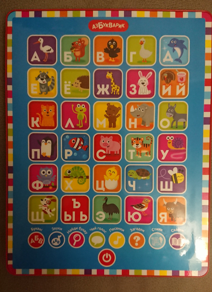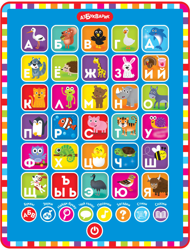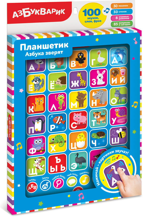 Азбукварик Планшет «Азбука зверят»В данный момент этот товар отсутствует в продаже. Возможно, у нас найдется аналогичный или похожий товар здесь. С новым планшетиком «Азбука зверят» можно и учиться, и веселиться! Ребенку понравится изучать буквы со зверятами: Б – Белка, Д – дельфин, Ж – жираф, всё просто! В планшетике 8 игровых режимов: «Буквы», «Звуки», «Найди букву», «Чей голос», «Песенки», «Загадки», «Стихи», «Сказки». 30 стихов (азбука в стихах) помогут лучше запомнить буквы, а 85 вопросов и загадок – проверить знания. После интенсивных занятий ребенок может отдохнуть: послушать 30 песенок о зверятах и 3 сказки («Заяц и черепаха», «Лягушка-путешественница», «Тигрёнок»). Все картинки звучат! |