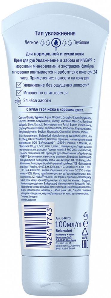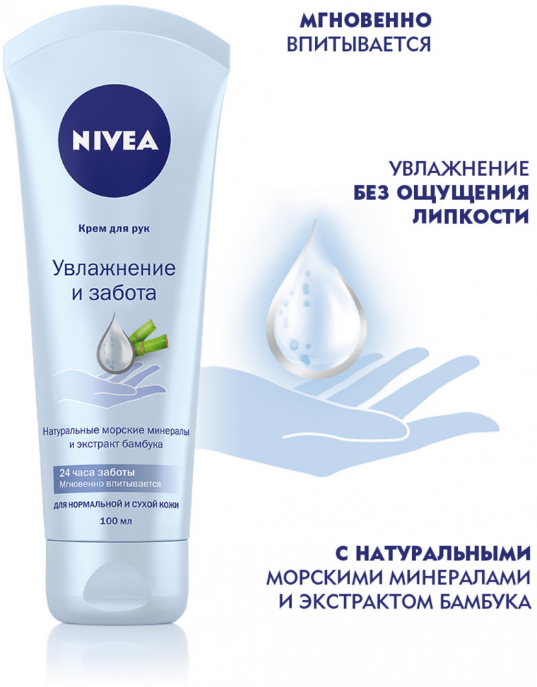 NIVEA Крем для рук «Увлажнение и забота»В данный момент этот товар отсутствует в продаже. Возможно, у нас найдется аналогичный или похожий товар здесь. Крем для рук «Увлажнение и забота» от NIVEA содержит в своем составе морские минералы и экстракт бамбука, обеспечивают нежный уход и увлажнение в течение 24 часов. Легкая текстура мгновенно впитывается, не оставляя ощущения липкости на коже. |