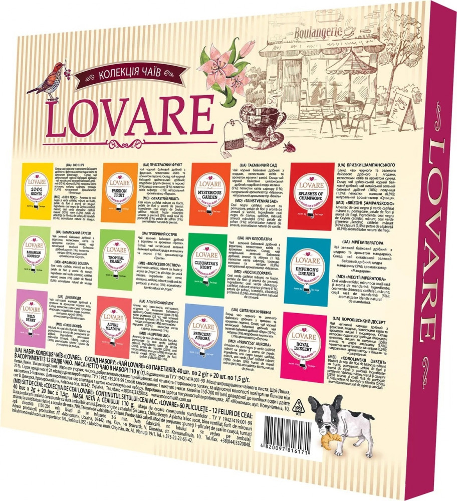 Lovare Набор чая «Ассорти»В данный момент этот товар отсутствует в продаже. Возможно, у нас найдется аналогичный или похожий товар здесь. Чайный набор-ассорти Lovare из 12 самых популярных видов чая в оригинальном исполнении в виде портфельчика с ручкой. В портфельчике находится 12 видов чая по 5 пакетиков: «1001 ночь», «Брызги шампанского», «Фрукты страсти», «Дикие ягоды», «Ночь Клеопатры», «Багамский саусеп», «Золотой манго», «Клубничный зефир», «Королевский десерт», «Альпийский луг», «Цитрусовая мелисса», «Ягодный пирог». |