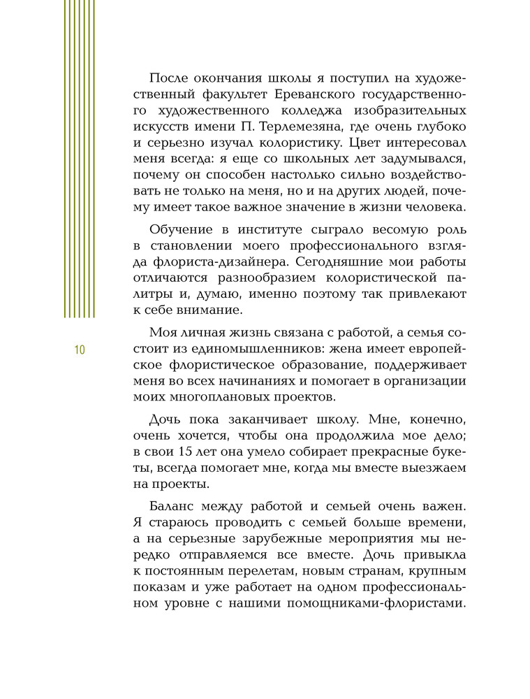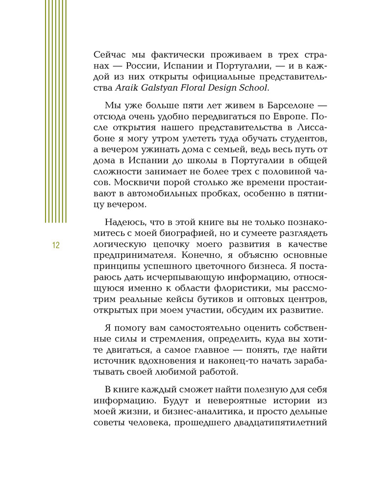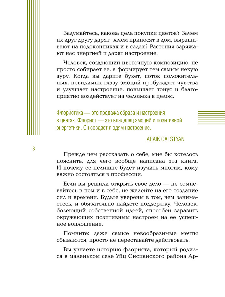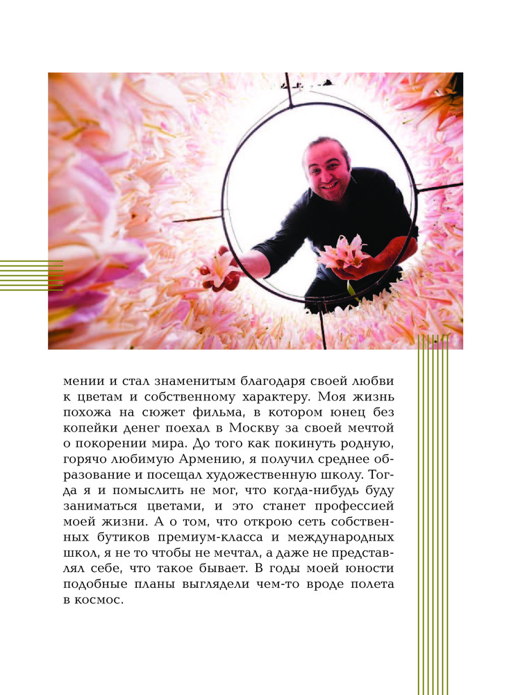 Миллион на цветах. Флористика как успешный бизнесВ данный момент этот товар отсутствует в продаже. Возможно, у нас найдется аналогичный или похожий товар здесь. Араик Галстян — российский флорист-дизайнер. Создатель крупнейшей школы обучения флористов по всему миру. Основатель Araik Galstyan Floral Design House, Araik Galstyan Moscow International Floral Design school. Единственный флорист в мире, дважды завоевавший приз зрительских симпатий: на чемпионате мира по профессиональной флористике в Китае и на чемпионате Европы по профессиональной флористике в Чехии. |
