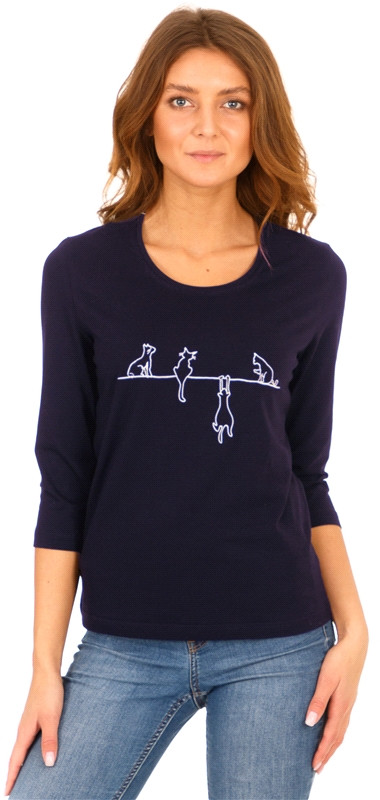 Приятный средней плотности трикотаж, рисунок вышитый (что выигрышно по сравнению с текстильным рисунком), на размер 48 хорошая слегка свободная посадка, красивый ворот. После стирки не растянулась.