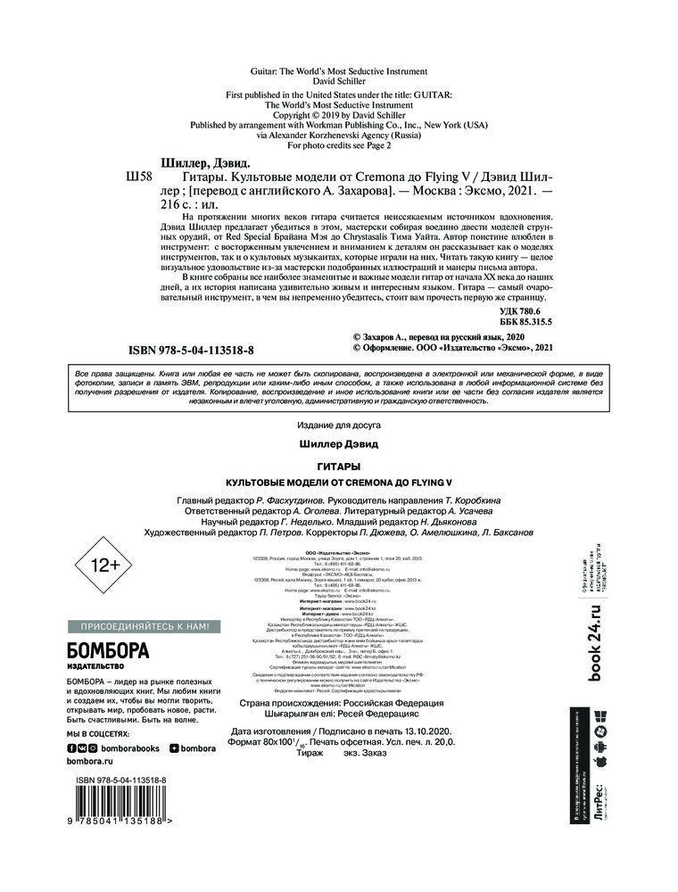 💳 Оплатить за товар можно при получении 🇰🇿 Есть бесплатная доставка по Казахстану от 1 дня 🎁 Копите бонусы с каждой покупки Серия: Подарочные издания. Музыка На протяжении многих веков гитара считается неиссякаемым источником вдохновения. Дэвид Шиллер предлагает убедиться в этом, мастерски собирая воедино двести моделей струнных орудий, от Red Special Брайана Мэя до Chrystasalis Тима Уайта. Автор поистине влюблен в инструмент: с восторженным увлечением и вниманием к деталям он рассказывает как о моделях инструментов, так и о культовых музыкантах, которые играли на них. Читать такую книгу — целое визуальное удовольствие из-за мастерски подобранных иллюстраций и манеры письма автора. |