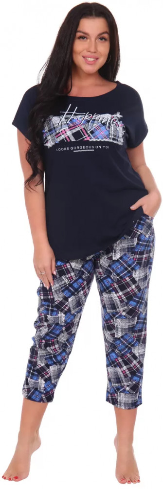 Комплект понравился, соответствует фото. Фасон продуман, вырез - лодочка, на штанах резинка мягкая, два кармашка. Нигде не давит, но, думаю, на размер больше надо брать, чтобы посвободней. Ткань неплотная, комфортная, хлопок.