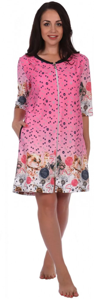 Халат очень хорошо сшит. Веселенький, мягкий, удобные карманы и такая прекрасная застежка-молния! Описанию соответствует. Халат действительно молодежный. Нам на 44-46 размер подошел и тот и другой, но коротковат и узкий рукав, не комфортно. Отказ.