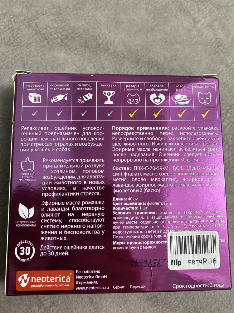 Обычно покупали только капли этой фирмы,решили взять ошейник.Пришёл упакованный и очень быстро.Запах есть.