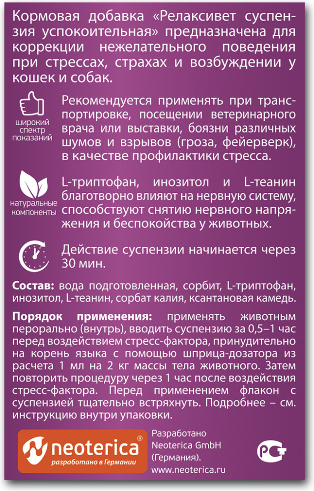 Relaxivet Суспензия успокоительнаяВ данный момент этот товар отсутствует в продаже. Возможно, у нас найдется аналогичный или похожий товар здесь. Релаксивет суспензия успокоительная предназначена для коррекции нежелательного поведения при стрессах, страхах и возбуждении у кошек и собак. |