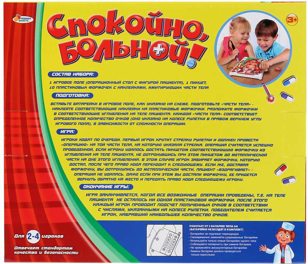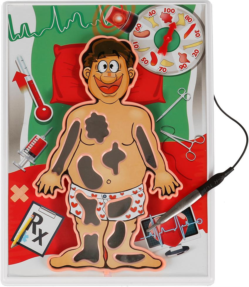 💳 Оплатить за товар можно при получении 🇰🇿 Есть бесплатная доставка по Казахстану 🎁 Копите бонусы с каждой покупки «Спокойно, больной!» это весёлая настольная игра, которая не даст скучать Вашим детям и позволит отлично провести время! Это своеобразный тренажёр для развития мелкой моторики рук, координации движений, глазомера и ловкости. Игра может использоваться как в домашних условиях, так и в детских учреждениях. Игра позволяет детям почувствовать себя настоящими врачами, даёт возможность провести «операцию». Элементы набора изготовлены из металла и высококачественного прочного пластика, окрашенного устойчивыми яркими красителями. |