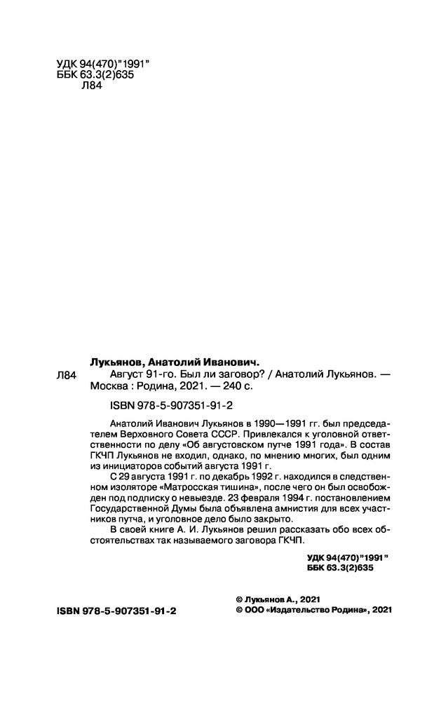 Август 91-го. Был ли заговор?В данный момент этот товар отсутствует в продаже. Возможно, у нас найдется аналогичный или похожий товар здесь. Серия: Лихолетье. Свидетели 1990-х Анатолий Иванович Лукьянов в 1990-1991 гг. был председателем Верховного Совета СССР. Привлекался к уголовной ответственности по делу «Об августовском путче 1991 года». В состав ГКЧП Лукьянов не входил, однако, по мнению многих, был одним из инициаторов событий августа 1991 года. С 29 августа 1991 г. по декабрь 1992 г. находился в следственном изоляторе «Матросская тишина», после чего он был освобожден под подписку о невыезде. 23 февраля 1994 г. постановлением Государственной Думы была объявлена амнистия для всех участников путча, и уголовное дело было закрыто. |