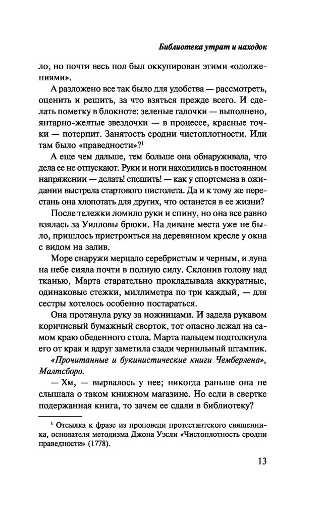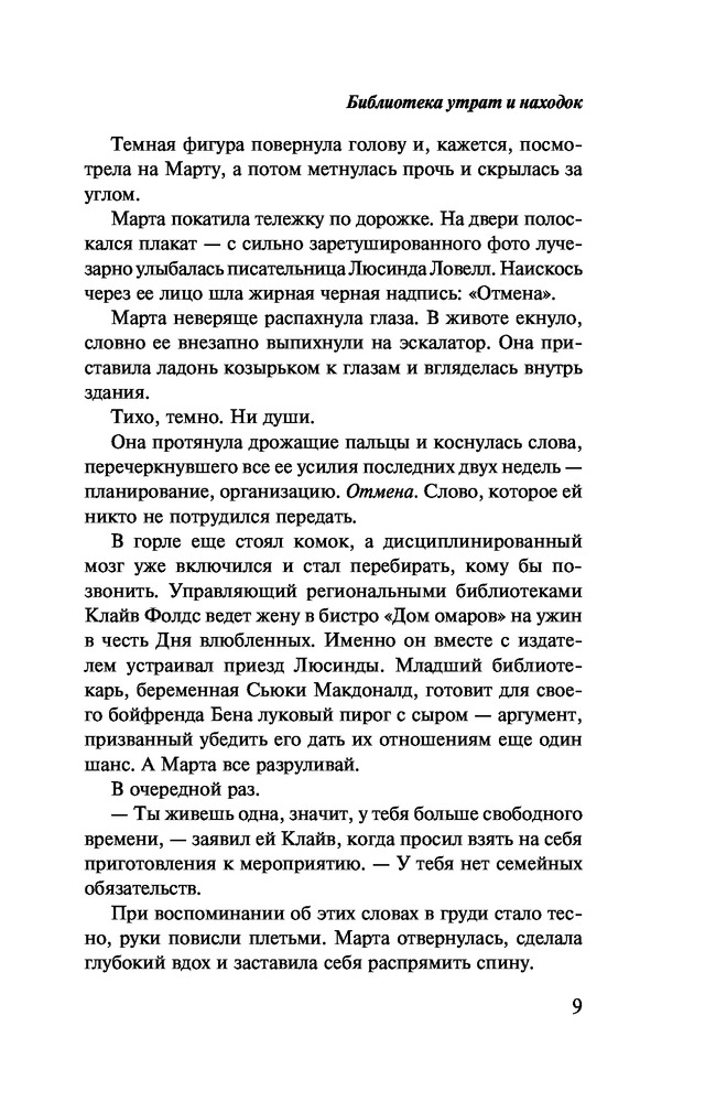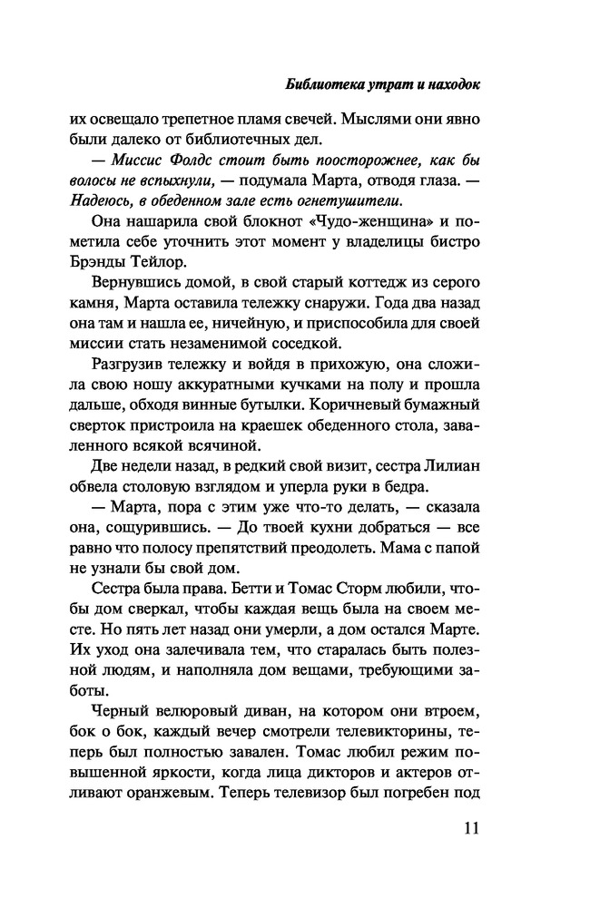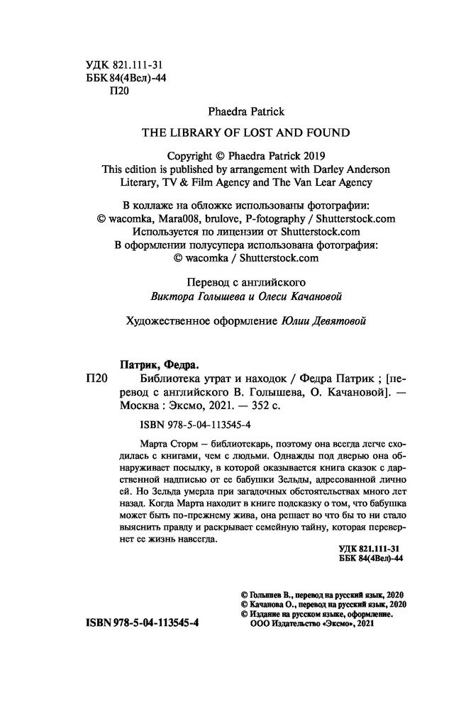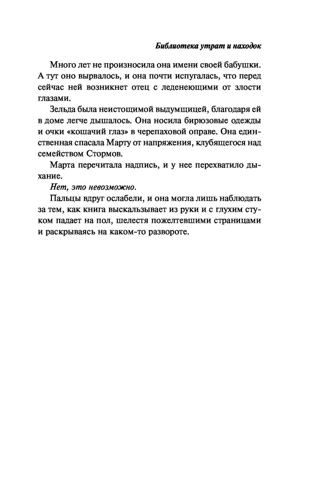 Библиотека утрат и находокВ данный момент этот товар отсутствует в продаже. Возможно, у нас найдется аналогичный или похожий товар здесь. Серия: Novel. Книги. Секреты. Любовь Марта Сторм — библиотекарь, потому она всегда легче сходилась с книгами, чем с людьми. Однажды под дверью она обнаруживает посылку, в которой оказывается книга сказок с дарственной надписью от ее бабушки Зельды, адресованной лично ей. Но Зельда умерла при загадочных обстоятельствах много лет назад. Когда Марта находит в книге подсказку о том, что бабушка может быть по-прежнему жива, она решает во что бы то ни стало выяснить правду и раскрывает семейную тайну, которая перевернет ее жизнь навсегда. |