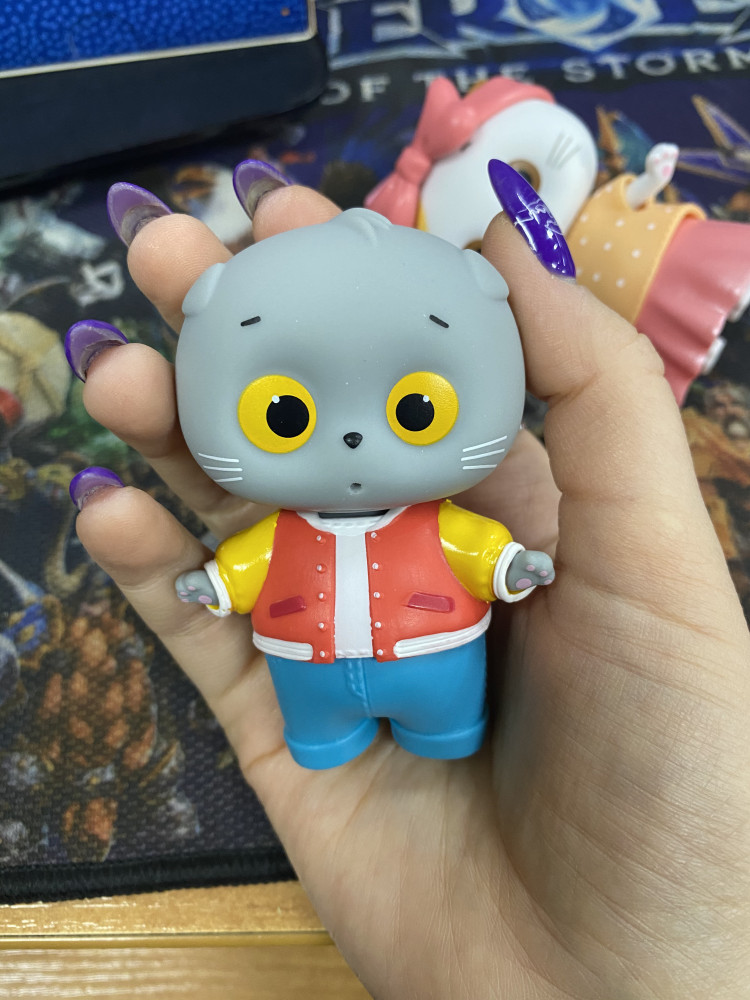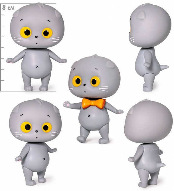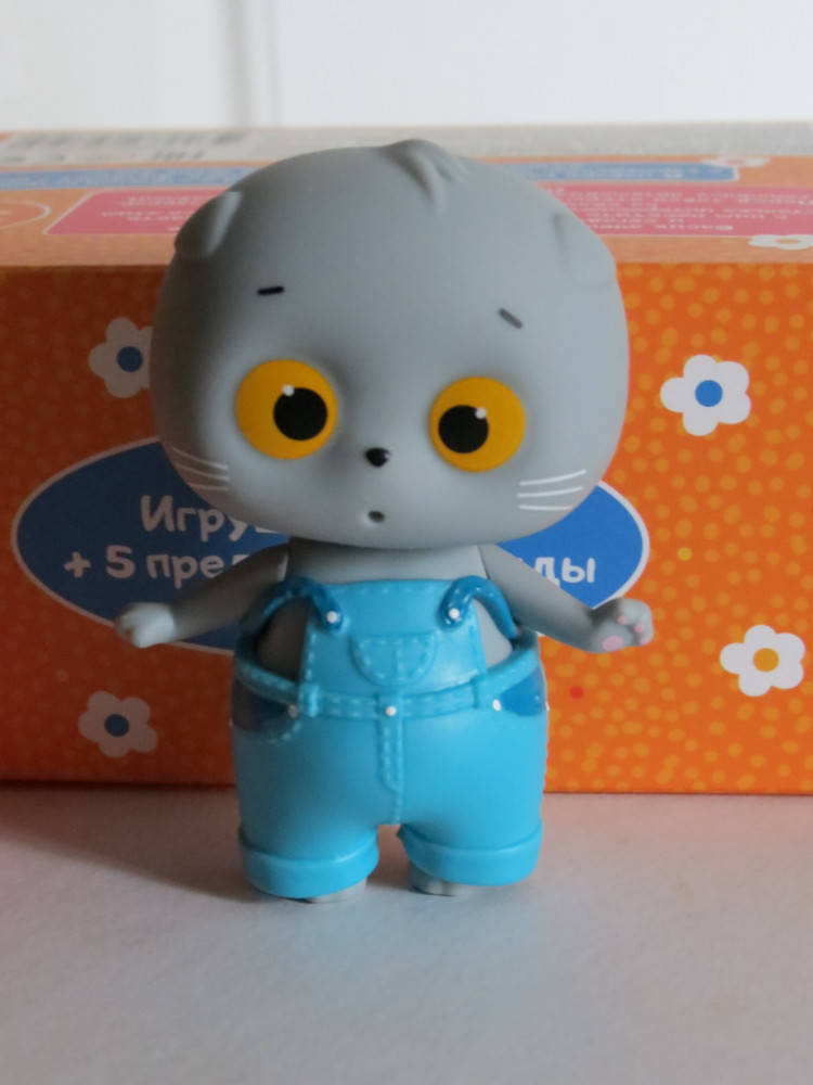Просто слов нет, какая это прелесть) голова котика выполнена из резины, тело из пластика. Очень приятно держать в руках. Ножки и ручки крутятся. Одежда из мягкой резины, одевается очень легко. Голову легко можно снять, чтобы убрать бантик. Одежда спрятана в боковых кармашках коробки, каждая в отдельном пакетике