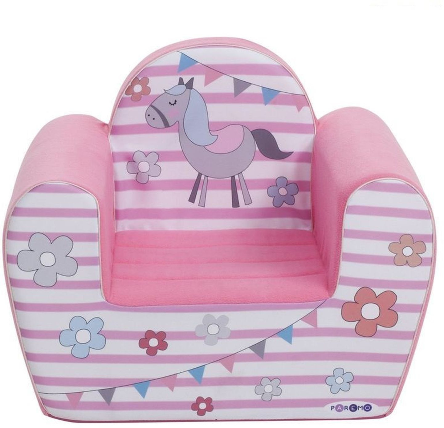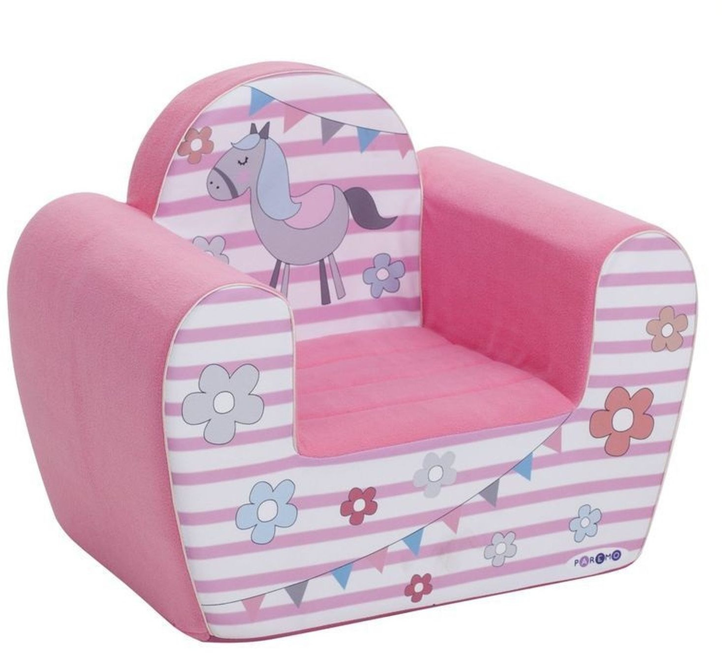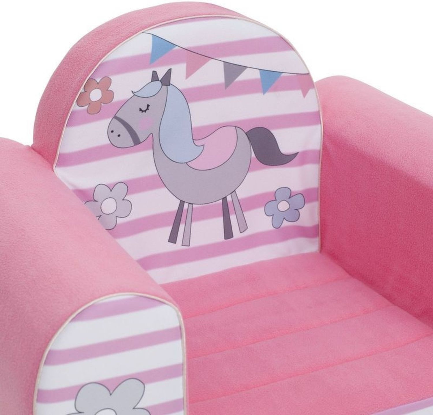 • кресло выполнено в нескольких нежно-розовом оттенке с разноцветными принтами на мило-полосатом фоне. Спинку украшает мультяшный принт с изображением праздничной лошадки по имени Крошка Ли. Креслице украшают полоски, цветочки и праздничные растяжки с флажками;