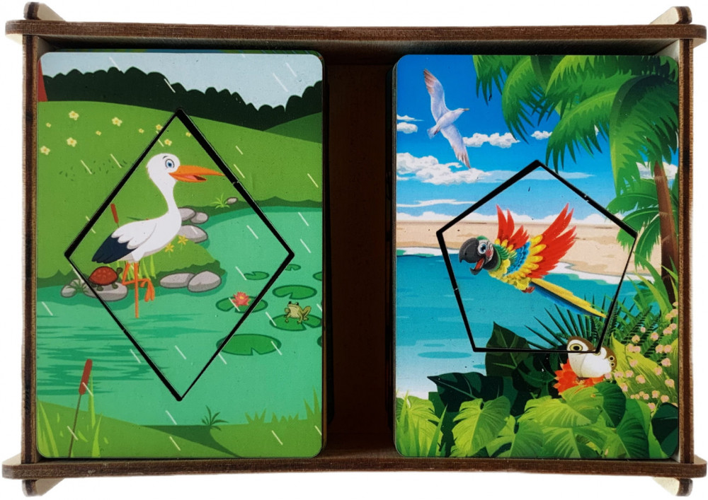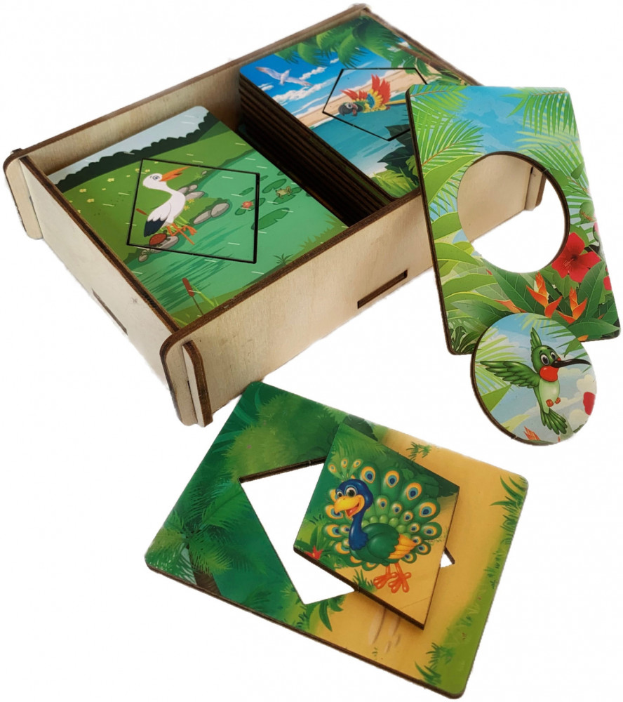 Предложите малышу найти каждой птичке свой «домик» — рамочку. Обратите внимание ребенка на то, что фигурка должна совпасть с нужным домиком не только по форме, а также еще и по деталям изображения. Обязательно проговаривайте названия птиц, коротко расскажите, где они живут (в джунглях, в лесу и тд.) и геометрических фигур, таким образом, малыш запомнит их легко и быстро.