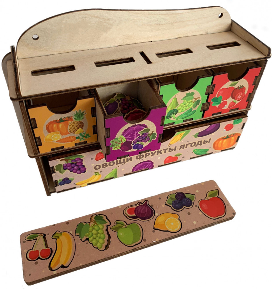 Название изготовлен из дерева — экологически чистого и гипоаллергенного материала. В комплектет: один «комодик» с ящиками и прорезями для опускания фигурок фруктов, ягод, овощей, один большой ящик — для хранения рамок — вкладышей с фигурками фруктов, ягод, овощей, четыре маленьких ящика, окрашенных в разные цвета: зеленый, желтый и оранжевый (один ящичек для двух цветов), красный, фиолетовый — для сортировки фигурок фруктов, ягод и овощей по цветам. Рамки — вкладыши представляют собой деревянные дощечки с выемками для фигур в количестве 4 шт.
